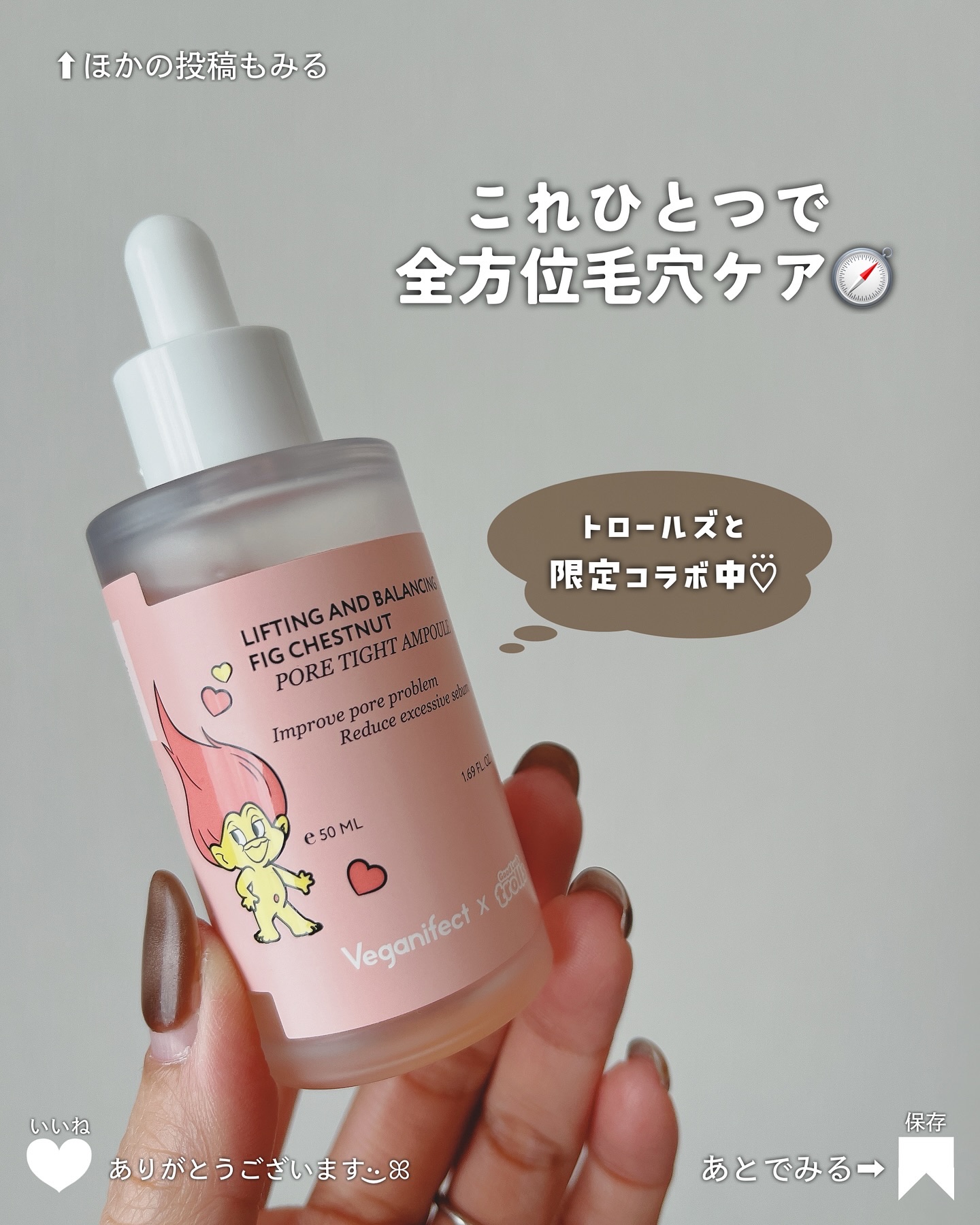 毛穴悩みにおすすめ! Veganifect イチジク毛穴アンプル ¥2,668 テクスチャはとろみがあるよ! 塗ったあとはモチモチ、サラサラなお肌! 4つの毛穴悩みに特化⭐️ 今だけトロールズコラボ!