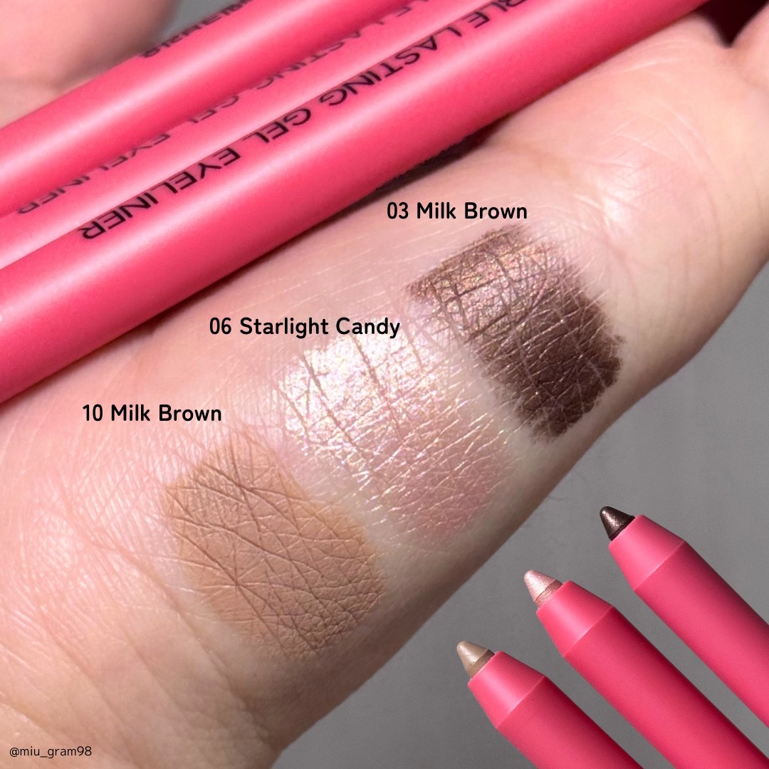 本当に発色が良いです◎ 軽く描くだけではっきり発色で😘 03番のお色が少しラメがあるのでアイライナーとして引いた後ぼかすと良い感じになじみます◎ 擦れにも強いので安心です◎
