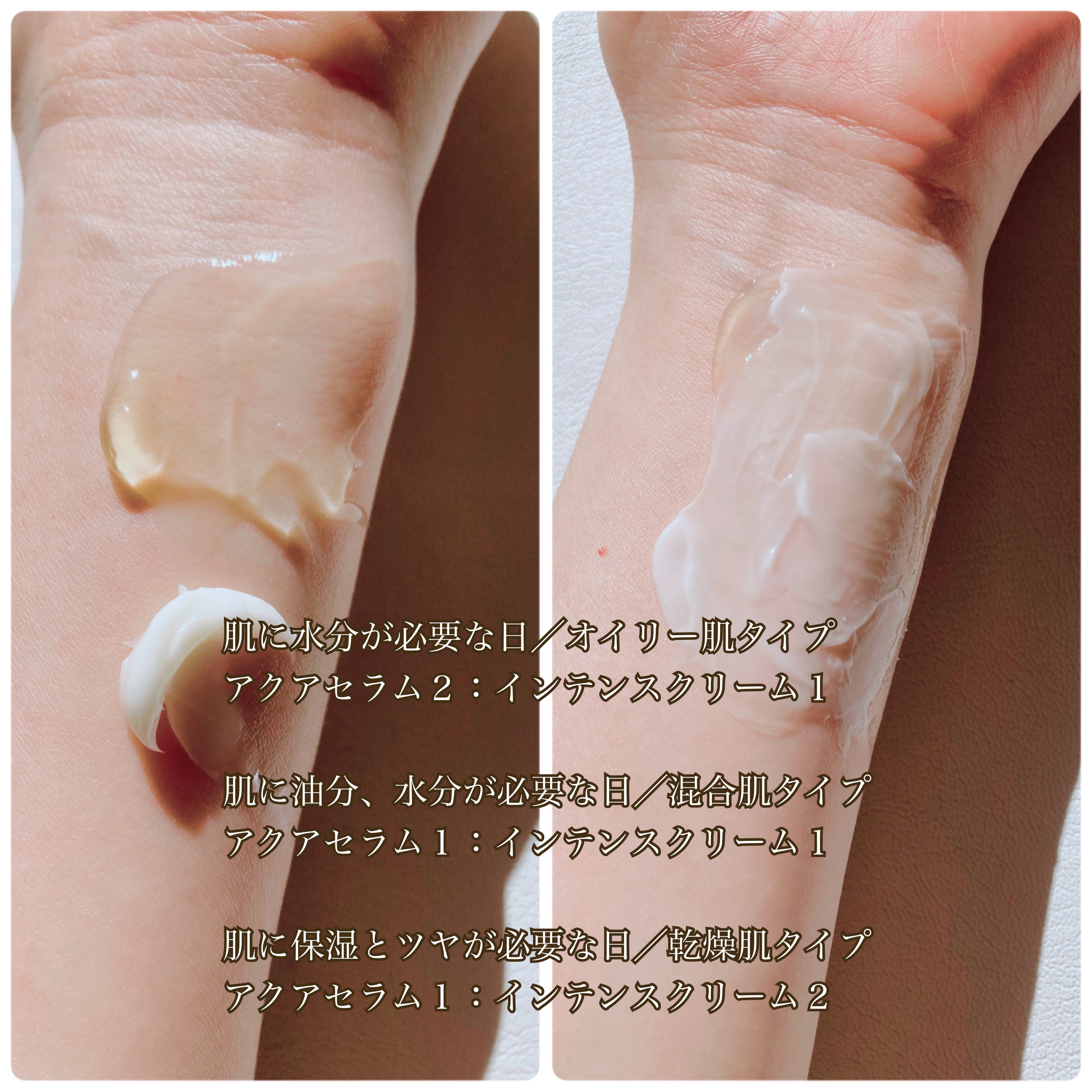 - アクサセラムとインテンスクリームのデュアル・フォーミュラで肌のタイプやコンディションに合わせて 比率を調節してカスタマイズ・ケアします。 ・アクアセラム:ヒアルロン酸、パンテノール、ツボクサエキス*が含まれた、さっぱりとした使用感で肌に水分を与え肌のキメを整えます。*ヒアルロン酸・パンテノール・ツボクサエキス(いずれも保湿成分) ・インテンスクリーム:イタリア産ホワイトトリュフ*が含まれた、もっちりした使用感で肌にうるおいを与えツヤのあるもち肌へ導きます。*ツベルマグナツムエキス(保湿成分) イタリアヴィーガン認証V-LABEL取得 皮膚低刺激テスト済み *全ての方に皮膚刺激が発生しないということではありません。 【使い方】 1. 洗顔後、スパチュラで肌のコンディションによって、セーラムとクリームを適量を取り、 ミックスしてから顔全体に優しく塗り広げ、 吸収させます。※ 必要に応じて、アクアセラムとインテンスクリームは単品でも使用できます。 【使用上の注意】 お肌に異常が生じていないかよく注意して使用してください。化粧品がお肌に合わないとき即ち次のような場合には、使用を中止してください。そのまま使用を続けますと、症状を悪化させることがありますので、皮ふ科専門医等にご相談されることをおすすめします。 (1)使用中、赤味、はれ、かゆみ、刺激、色抜け(白斑等)や黒ずみ等の異常があらわれた場合 (2)使用したお肌に、直射日光があたって(1)のような異常があらわれた場合