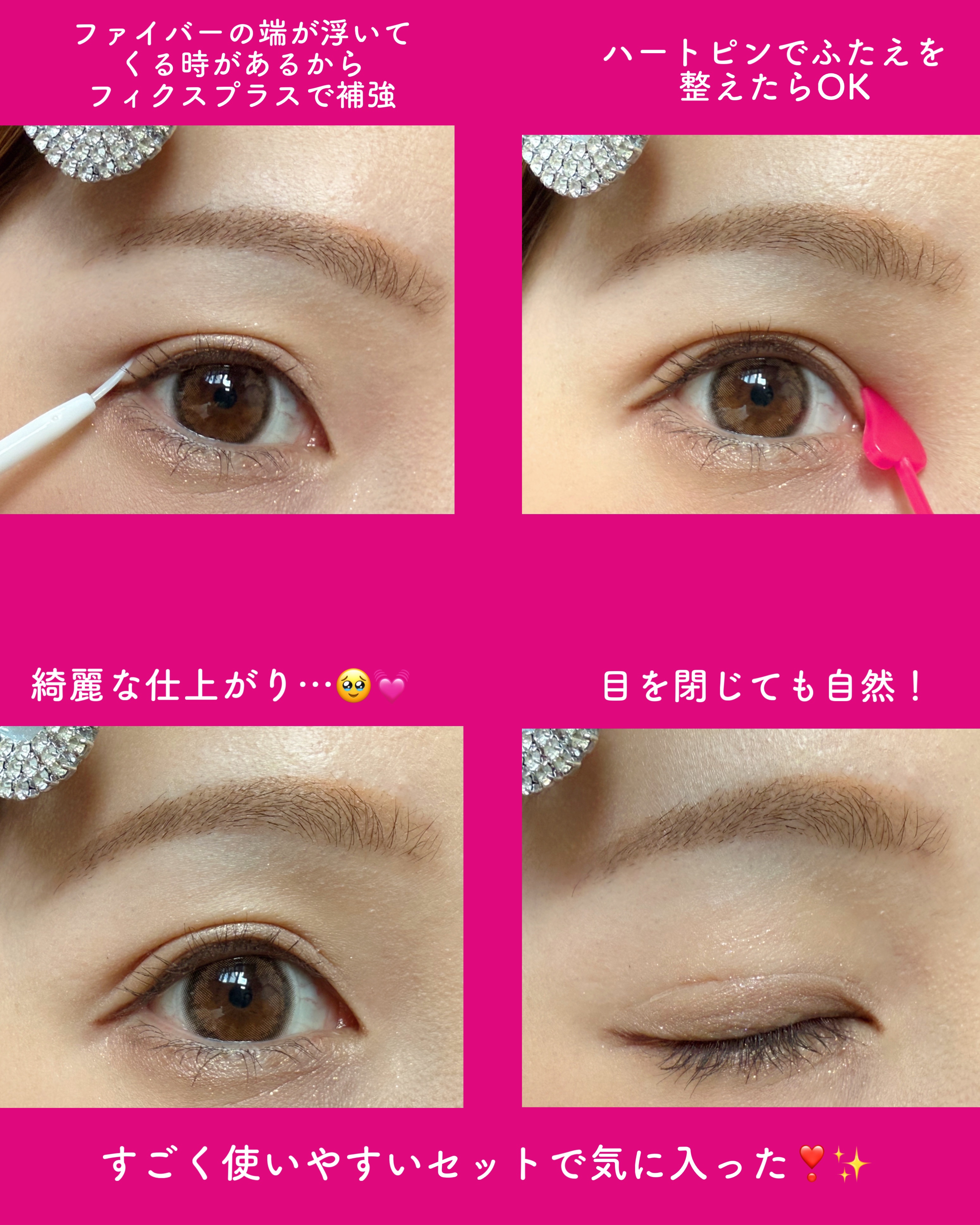 医療用として開発された伸縮性のある極細粘着ファイバーがまぶたにくい込み、立体的なふたえを形成してくれる🙆♀️✨ 目を閉じてもひきつれず、アップ画像にも耐えられる自然な二重はプールも入れる超ウォータープルーフで、運動時にも安心🫨💓 フィクスプラスがあることでより密着感が増す✨ あとクリップカッターが超便利◎