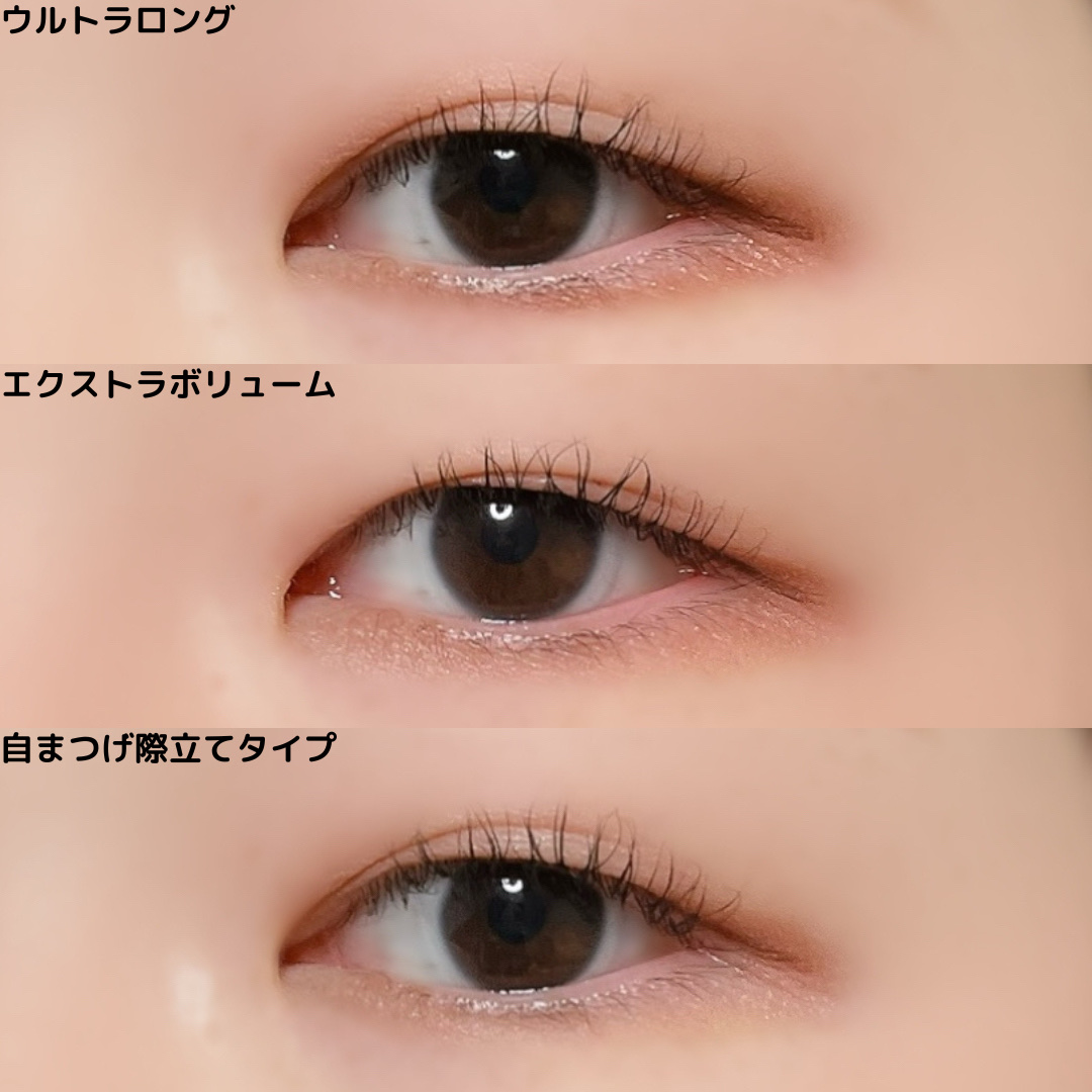 全てブラックカラーのマスカラですが、形も発色も仕上がりも違います✨ 自まつげ際立てタイプは、ブラシ細めで透けるようなブラック、細かいとこまでキャッチしてくれてパンダ目になりにくい! ボリュームタイプも、太めでカーブ感のあるブラシです!しっかりまつげを際立てるならこちらですが、パンダ目になりやすいです。