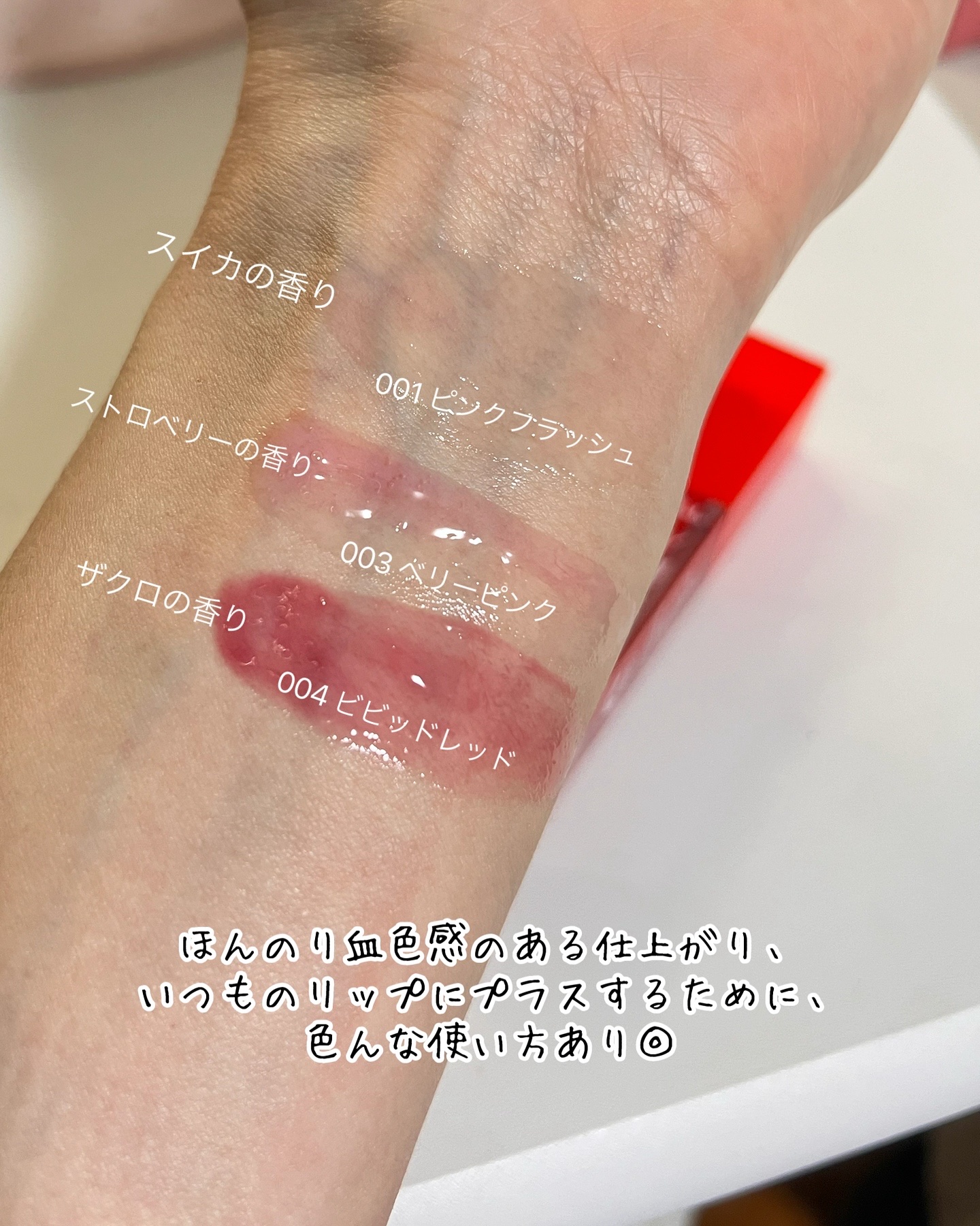 - <001 ピンクフラッシュ(スイカの香り)> 水添ポリイソブテン、イソノナン酸イソノニル、(エチレン/プロピレン/スチレン)コポリマー、リンゴ酸ジイソステアリル、ポリブテン、(ブチレン/エチレン/スチレン)コポリマー、香料、酢酸トコフェロール、トリ(カプリル/カプリン酸)グリセリル、ヤシ油、ヨーロッパキイチゴ種子油、クダモノトケイソウ種子油、テトラ(ジ-t-ブチルヒドロキシヒドロケイヒ酸)ペンタエリスリチル、BHT、ワカメエキス、トコフェロール、トリエトキシカプリリルシラン、オレフィン(C20-24).[+/-]赤202、黄4、合成フルオロフロゴパイト、水酸化Al、硫酸Ba <003 ベリーピンク(ストロベリーの香り)> 水添ポリイソブテン、イソノナン酸イソノニル、(エチレン/プロピレン/スチレン)コポリマー、リンゴ酸ジイソステアリル、ポリブテン、(ブチレン/エチレン/スチレン)コポリマー、香料、酢酸トコフェロール、トリ(カプリル/カプリン酸)グリセリル、ヤシ油、ヨーロッパキイチゴ種子油、クダモノトケイソウ種子油、テトラ(ジ-t-ブチルヒドロキシヒドロケイヒ酸)ペンタエリスリチル、BHT、ワカメエキス、トコフェロール、トリエトキシカプリリルシラン、オレフィン(C20-24).[+/-]赤202、黄4、合成フルオロフロゴパイト、水酸化Al、硫酸Ba <004 ビビッドレッド(ザクロの香り)> 水添ポリイソブテン、イソノナン酸イソノニル、(エチレン/プロピレン/スチレン)コポリマー、リンゴ酸ジイソステアリル、ポリブテン、(ブチレン/エチレン/スチレン)コポリマー、香料、酢酸トコフェロール、トリ(カプリル/カプリン酸)グリセリル、ヤシ油、ヨーロッパキイチゴ種子油、クダモノトケイソウ種子油、テトラ(ジ-t-ブチルヒドロキシヒドロケイヒ酸)ペンタエリスリチル、BHT、ワカメエキス、トコフェロール、トリエトキシカプリリルシラン、オレフィン(C20-24).[+/-]赤202、黄4、合成フルオロフロゴパイト、水酸化Al、硫酸Ba
