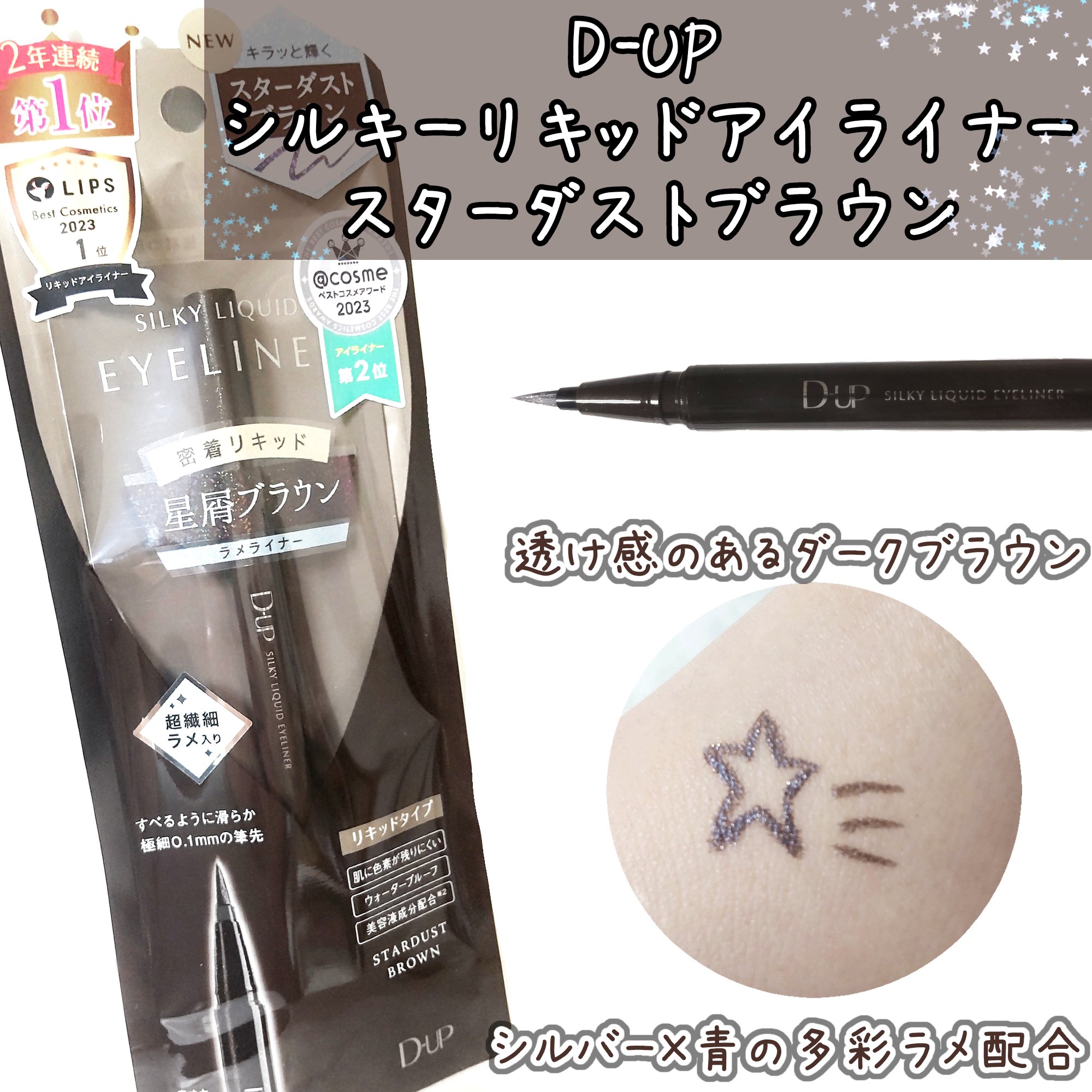 キラッと繊細に輝く‟星屑ブラウン” D-UP初のラメライナー「スターダストブラウン」 星屑を散りばめたような繊細な輝きで絶妙なアイライナー🫶 水・涙・皮脂に強いウォータープルーフそしてD-UPは描きやすい🥰
