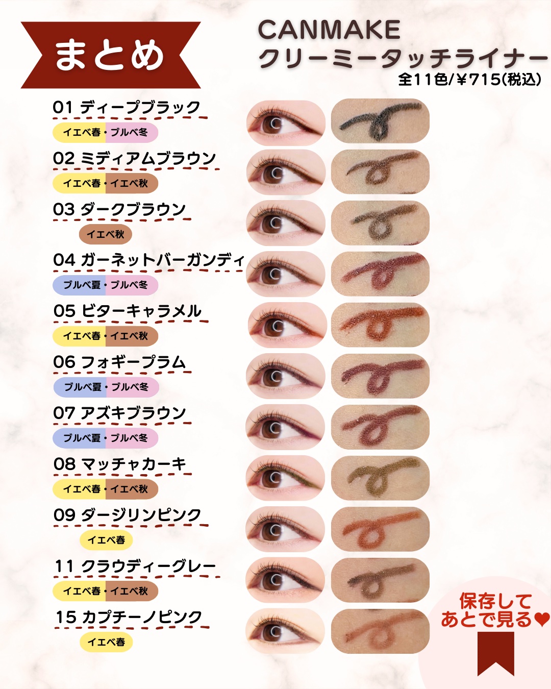 大人気コスメブランド【CANMAKE】から超コスパ◎・質感・使い心地◎・ヨレなささ◎のジェルアイライナーが発売されてるの知ってる? 全11色をパーソナルカラー仕分けしてみたのでぜひ保存して参考にしてみてください🌈 【 01 ディープブラック 】目元をくっきり強調させる漆黒❤︎ 💛イエベ春・🩷ブルベ冬にオススメ❤︎