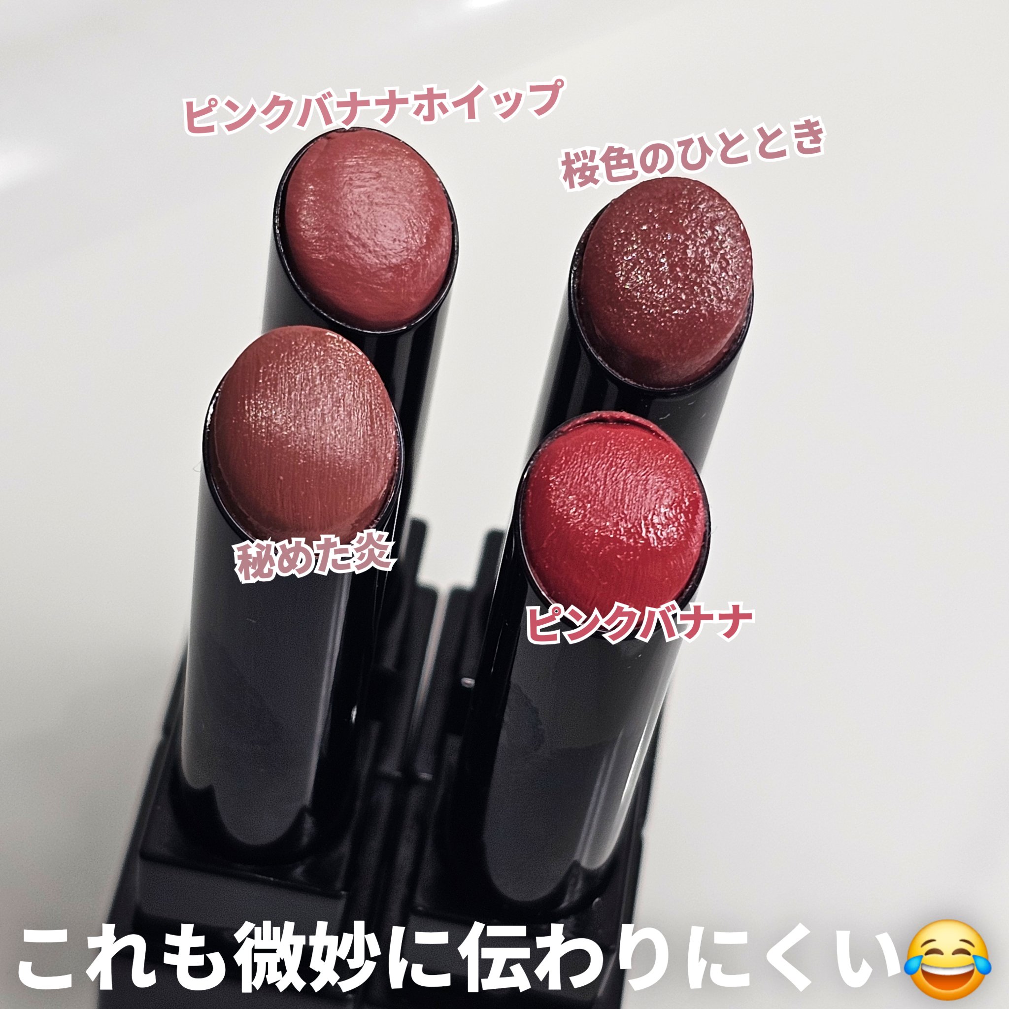 - <01 欲望の塊> テトライソステアリン酸ジペンタエリスリチル、トリ(カプリル酸/カプリン酸)グリセリル、オクチルドデカノール、ラウロイルグルタミン酸ジ(フィトステリル/オクチルドデシル)、ビスアルキル(C16-18)グリセリルウンデシルジメチコン、イソノナン酸イソトリデシル、水添ポリイソブテン、ラウロイルグルタミン酸ジ(オクチルドデシル/フィトステリル/ベヘニル)、パラフィン、合成ワックス、ダイマージリノール酸(フィトステリル/イソステアリル/セチル/ステアリル/ベヘニル)、マイクロクリスタリンワックス、水添マイクロクリスタリンワックス、ヒドロキシステアリン酸エチルヘキシル、トコフェロール、ホホバ種子油、オリーブ果実油、アーモンド油、(エチレン/プロピレン)コポリマー、ポリエチレン、ジメチコン、(+/-)(チタン/酸化チタン)焼結物、マイカ、ラウロイルアスパラギン酸Na、ラウロイルリシン、塩化亜鉛、酸化チタン、酸化鉄、水酸化Al、硫酸Ba、トリイソステアリン酸イソプロピルチタン、酸化スズ、ホウケイ酸(Ca/Al)、合成フルオロフロゴパイト、黄4、黄5、赤104(1)、赤201、赤202 <02 ピンクバナナ> テトライソステアリン酸ジペンタエリスリチル、トリ(カプリル酸/カプリン酸)グリセリル、オクチルドデカノール、ラウロイルグルタミン酸ジ(フィトステリル/オクチルドデシル)、ビスアルキル(C16-18)グリセリルウンデシルジメチコン、イソノナン酸イソトリデシル、水添ポリイソブテン、ラウロイルグルタミン酸ジ(オクチルドデシル/フィトステリル/ベヘニル)、パラフィン、合成ワックス、ダイマージリノール酸(フィトステリル/イソステアリル/セチル/ステアリル/ベヘニル)、マイクロクリスタリンワックス、水添マイクロクリスタリンワックス、ヒドロキシステアリン酸エチルヘキシル、トコフェロール、ホホバ種子油、オリーブ果実油、アーモンド油、(エチレン/プロピレン)コポリマー、ポリエチレン、ジメチコン、(+/-)(チタン/酸化チタン)焼結物、マイカ、ラウロイルアスパラギン酸Na、ラウロイルリシン、塩化亜鉛、酸化チタン、酸化鉄、水酸化Al、硫酸Ba、トリイソステアリン酸イソプロピルチタン、酸化スズ、ホウケイ酸(Ca/Al)、合成フルオロフロゴパイト、黄4、黄5、赤104(1)、赤201、赤202 <03 陽炎> テトライソステアリン酸ジペンタエリスリチル、トリ(カプリル酸/カプリン酸)グリセリル、オクチルドデカノール、ラウロイルグルタミン酸ジ(フィトステリル/オクチルドデシル)、ビスアルキル(C16-18)グリセリルウンデシルジメチコン、イソノナン酸イソトリデシル、水添ポリイソブテン、ラウロイルグルタミン酸ジ(オクチルドデシル/フィトステリル/ベヘニル)、パラフィン、合成ワックス、ダイマージリノール酸(フィトステリル/イソステアリル/セチル/ステアリル/ベヘニル)、マイクロクリスタリンワックス、水添マイクロクリスタリンワックス、ヒドロキシステアリン酸エチルヘキシル、トコフェロール、ホホバ種子油、オリーブ果実油、アーモンド油、(エチレン/プロピレン)コポリマー、ポリエチレン、ジメチコン、(+/-)(チタン/酸化チタン)焼結物、マイカ、ラウロイルアスパラギン酸Na、ラウロイルリシン、塩化亜鉛、酸化チタン、酸化鉄、水酸化Al、硫酸Ba、トリイソステアリン酸イソプロピルチタン、酸化スズ、ホウケイ酸(Ca/Al)、合成フルオロフロゴパイト、黄4、黄5、赤104(1)、赤201、赤202 <04 パンプキンワイン> テトライソステアリン酸ジペンタエリスリチル、トリ(カプリル酸/カプリン酸)グリセリル、オクチルドデカノール、ラウロイルグルタミン酸ジ(フィトステリル/オクチルドデシル)、ビスアルキル(C16-18)グリセリルウンデシルジメチコン、イソノナン酸イソトリデシル、水添ポリイソブテン、ラウロイルグルタミン酸ジ(オクチルドデシル/フィトステリル/ベヘニル)、パラフィン、合成ワックス、ダイマージリノール酸(フィトステリル/イソステアリル/セチル/ステアリル/ベヘニル)、マイクロクリスタリンワックス、水添マイクロクリスタリンワックス、ヒドロキシステアリン酸エチルヘキシル、トコフェロール、ホホバ種子油、オリーブ果実油、アーモンド油、(エチレン/プロピレン)コポリマー、ポリエチレン、ジメチコン、(+/-)(チタン/酸化チタン)焼結物、マイカ、ラウロイルアスパラギン酸Na、ラウロイルリシン、塩化亜鉛、酸化チタン、酸化鉄、水酸化Al、硫酸Ba、トリイソステアリン酸イソプロピルチタン、酸化スズ、ホウケイ酸(Ca/Al)、合成フルオロフロゴパイト、黄4、黄5、赤104(1)、赤201、赤202 <05 ダークフィグ> テトライソステアリン酸ジペンタエリスリチル、トリ(カプリル酸/カプリン酸)グリセリル、オクチルドデカノール、ラウロイルグルタミン酸ジ(フィトステリル/オクチルドデシル)、ビスアルキル(C16-18)グリセリルウンデシルジメチコン、イソノナン酸イソトリデシル、水添ポリイソブテン、ラウロイルグルタミン酸ジ(オクチルドデシル/フィトステリル/ベヘニル)、