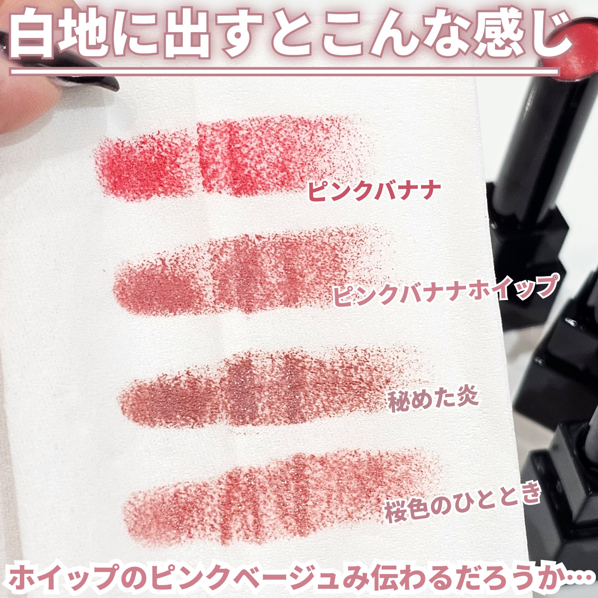 EX-4 ピンクバナナホイップは、私の場合、主張は控えめで思っていた以上に肌に馴染む印象。 とは言え、02 ピンクバナナよりもまろやかな色味。この敢えて気取っていない感じが大人も使いやすい。 ネーミングセンスはもちろん、なめらかな塗り心地や落ちにくさ、 そして購買意欲の湧く限定色。まさに期待を裏切らないリップモンスターはさすが。