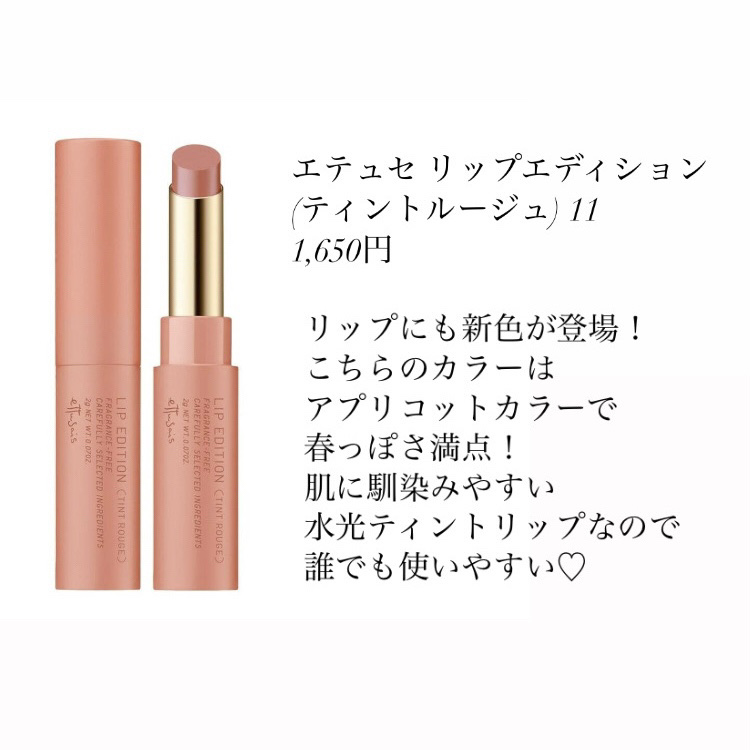 エテュセ アイエディション(カラーパレット) 21 アプリコットチュール ¥1,540 エテュセ アイラッシュ リフトカーラー ¥1,650 エテュセ ラスティング ジェルライナー 09 ヘーゼルチャイ 18 アプリコットブラウン ¥1,430