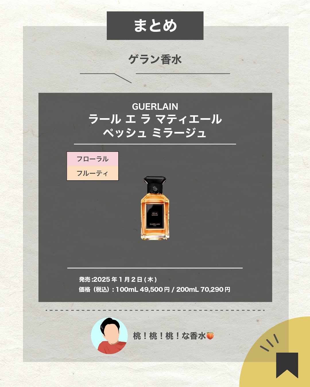 GUERLAIN ラール エ ラ マティエール ペッシュ ミラージュ 発売:2025年1月2日(木) 価格(税込): 100mL 49,500円 / 200mL 70,290円 毎月200万人が訪れる国内最大級の香水アカウント👑 プレゼントにおすすめ #香水マニア #香りフェチ #期間限定
