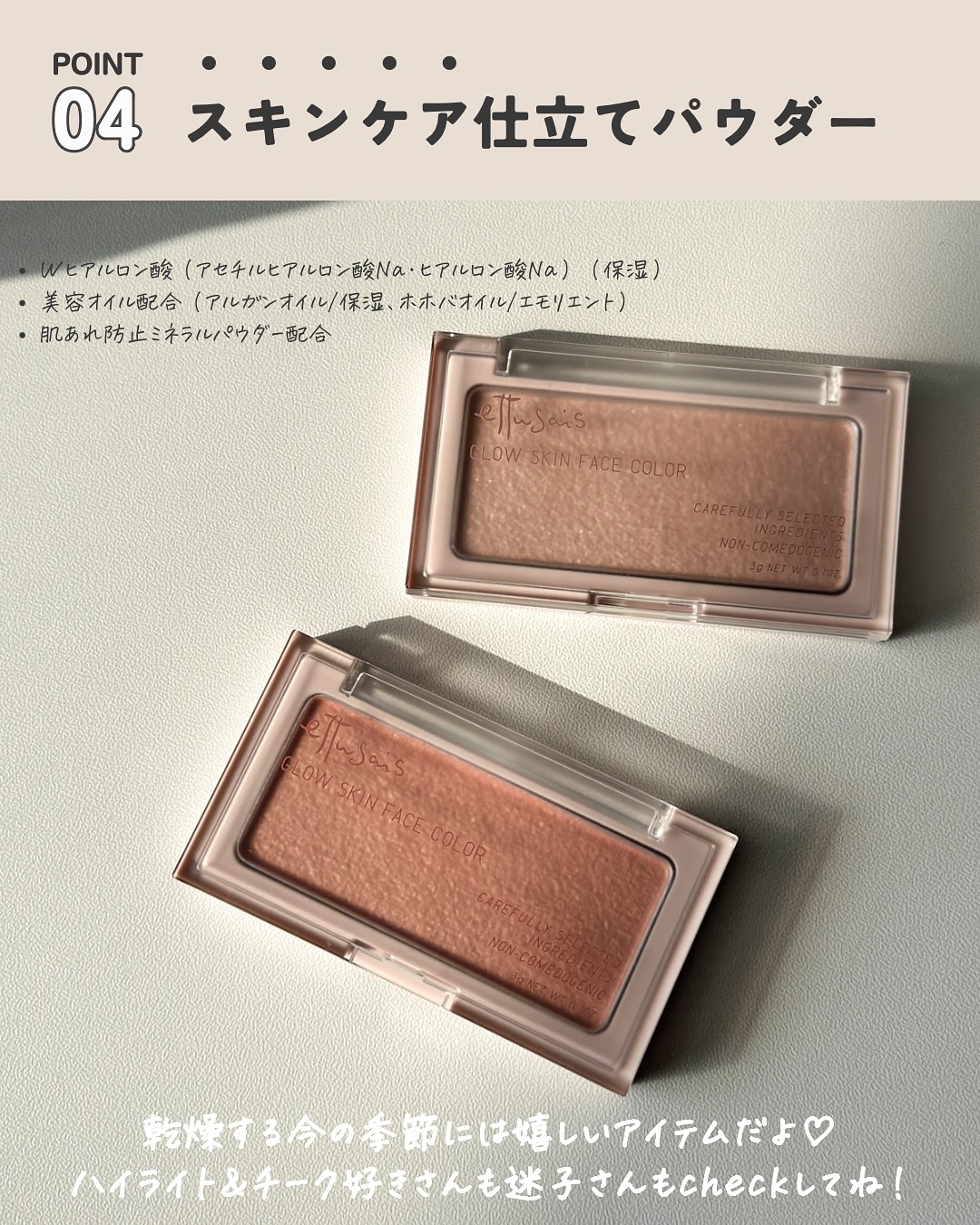 エテュセのフェイスカラー、待ってましたー!! もうね、ほんとうに使用感がよかった✨ うるおいが長時間続くスキンケア仕立てでテクスチャーだけでなく肌もしっとりが続く🫧 01 なじみつやハイライト 繊細な輝きでうるおったツヤ肌を演出 白浮しないピンクベージュ♡