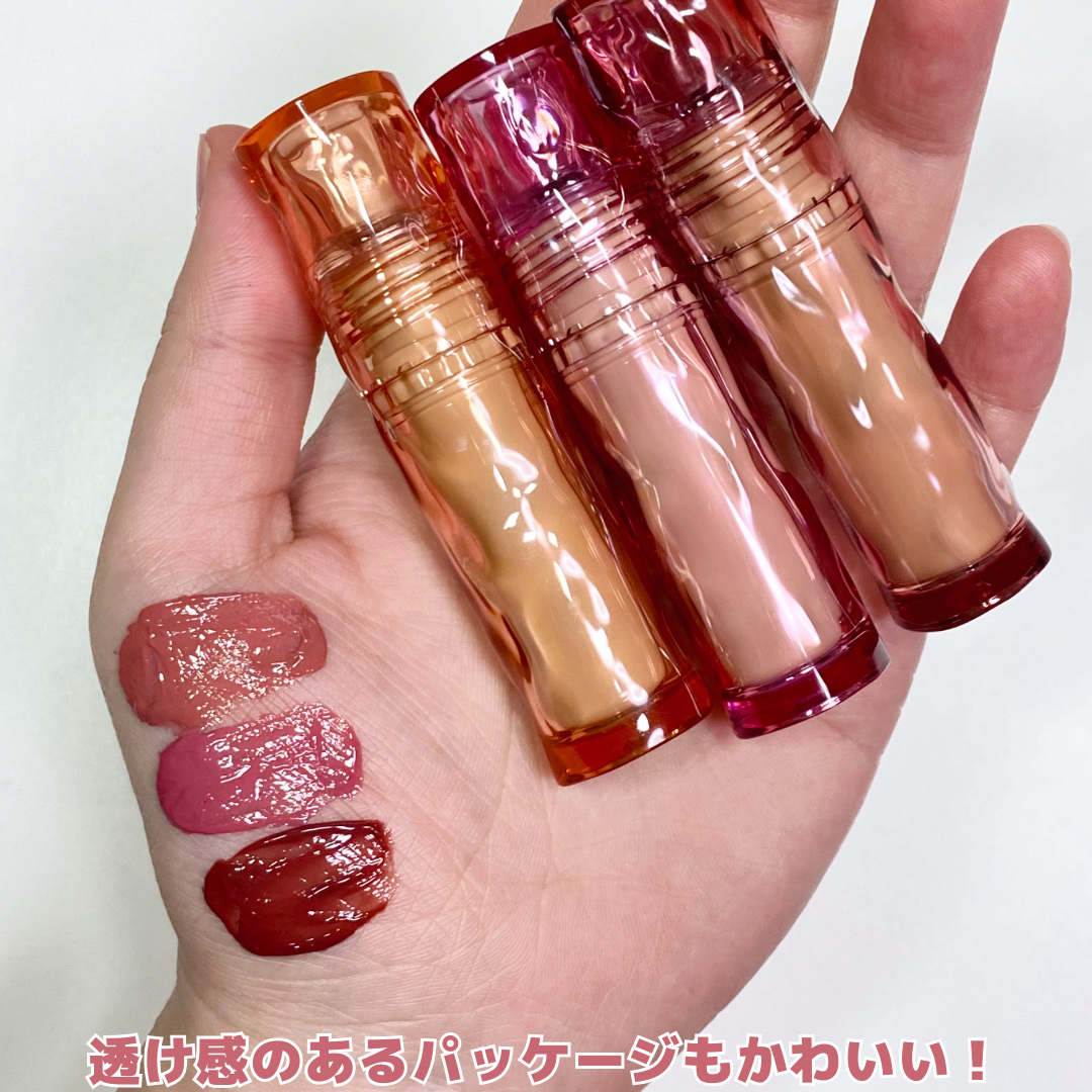 - 〇じゅわっとツヤがあふれてぷっくり仕上げ* *メイクアップ効果による ー塗ったあとにツヤオイル膜が浮き上がる、ツヤUPテクノロジー ー清涼成分メントキシプロパンジオール配合 〇オイルインウォーター処方で、うるおい感のあるちゅるんとした塗り心地 ー美容オイル配合 〇ティント成分配合で、色落ちしにくい 〇唇にフィットし、細部まで塗りやすいスパチュラタイプ 〇無香料