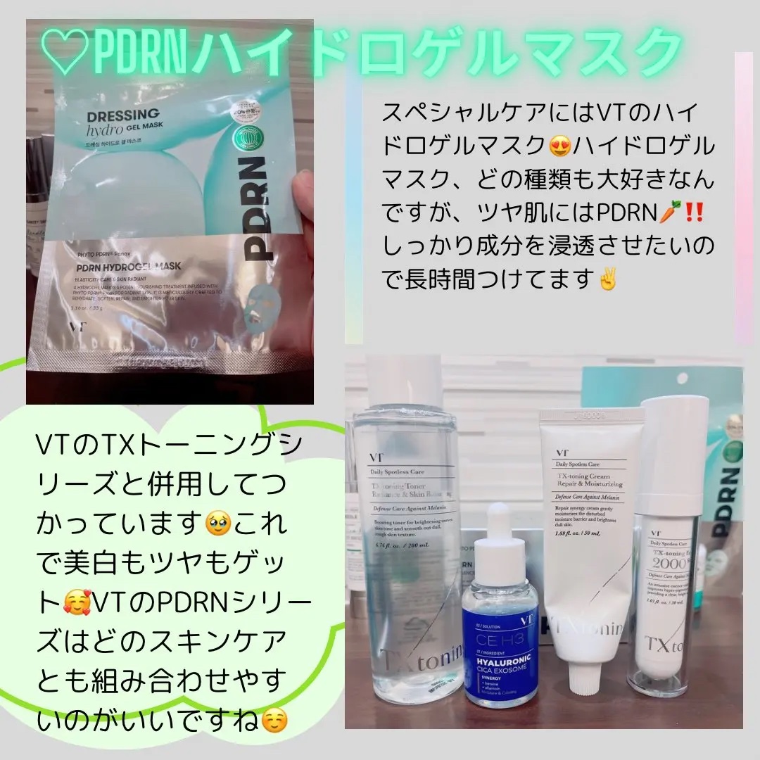 VTのPDRNは高麗人参由来の植物性✨ ヒアルロン酸やパンテノールなどの豊富な保湿成分が配合されています! シートは薄く密着力も高いので1日10分で簡単ケア出来ちゃいます💓 主要成分は植物性PDRN🌱𓂃 𓈒𓏸 動物性よりも粒子が小さいので肌角質層まで届けてくれます! セラミド5種やペプチド、CICAエクソソームなどが入っていて 乾燥肌さんや敏感肌さんに優しい👼🏻🪽 累計販売数1,170万本突破の大人気リードルショット🪡 水分たっぷりのみずみずしいテクスチャーです🫧💧 毛穴や肌荒れに悩んでいる方、肌のキメを整えたい方におすすめ✨