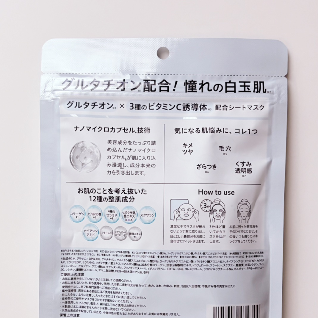 - <7枚> 水、グリセリン、DPG、BG、ナイアシンアミド、フラーレン、加水分解コラーゲン、スクワラン、ヒアルロン酸Na、セラミドNP、セラミドAP、セラミドEOP、セラミドNG、加水分解酵母エキス、ツボクサエキス、トコフェロール、フィトスフィンゴシン、グルタチオン、パルミチン酸アスコルビルリン酸3Na、3-グリセリルアスコルビン酸、パルミチン酸アスコルビル、アルブチン、糖脂質、水添レシチン、キサンタンガム、フェノキシエタノール、メチルパラベン、EDTA-2Na、クエン酸Na、PEG-60水添ヒマシ油、香料、コレステロール、ラウロイルラクチレートNa、カルボマー、PPG-4セテス-20、レシチン、酢酸トコフェロール、アマニ脂肪酸