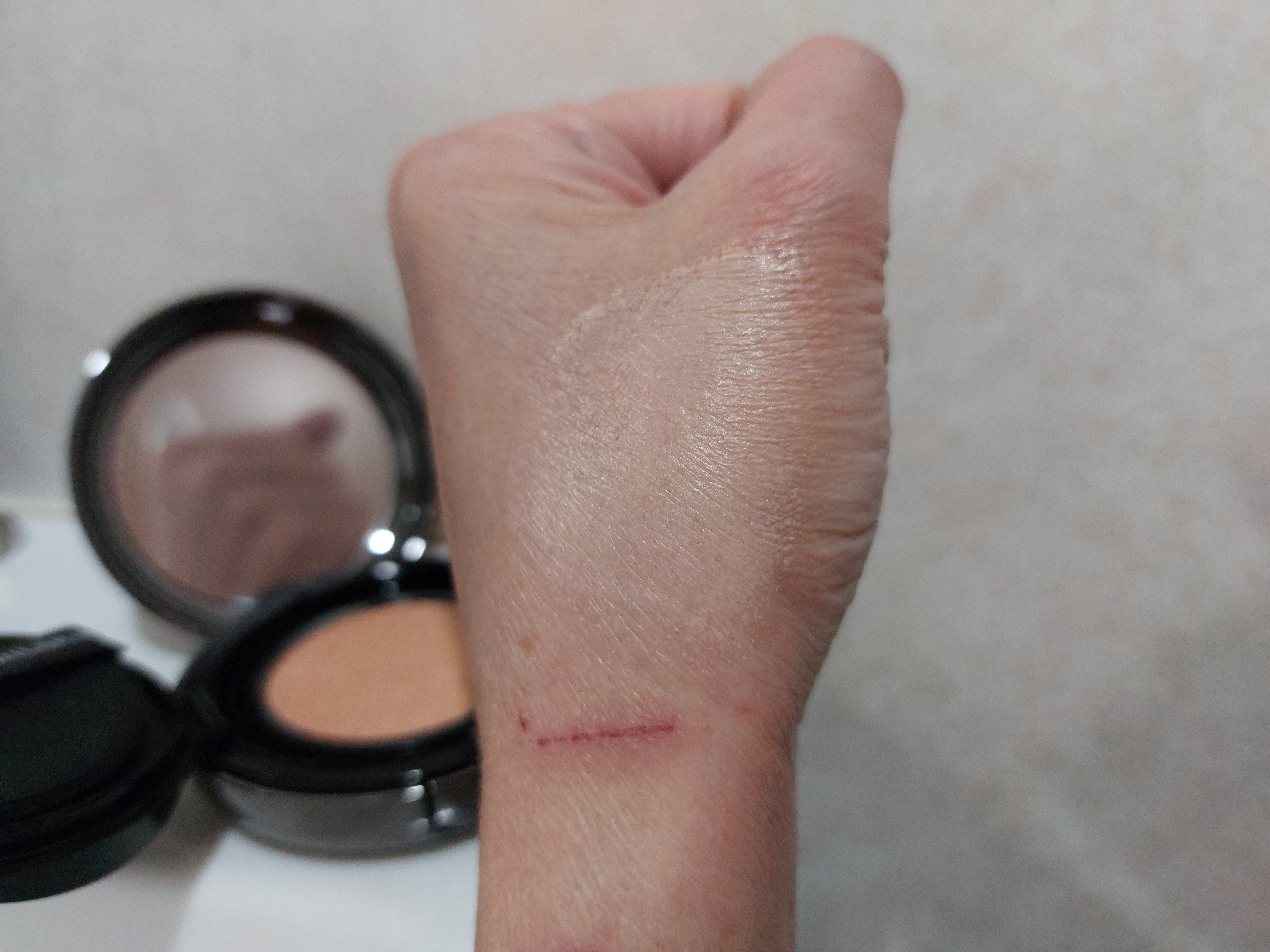 もちっとしたジェリーテクスチャーは、しっとりとした質感で粉っぽくないので指塗りしやすく、ポイントカラーも重ねやすい。 左のベースカラーは淡めの発色。 右のポイントカラーは見ためほど濃くならずにこちらも淡め。