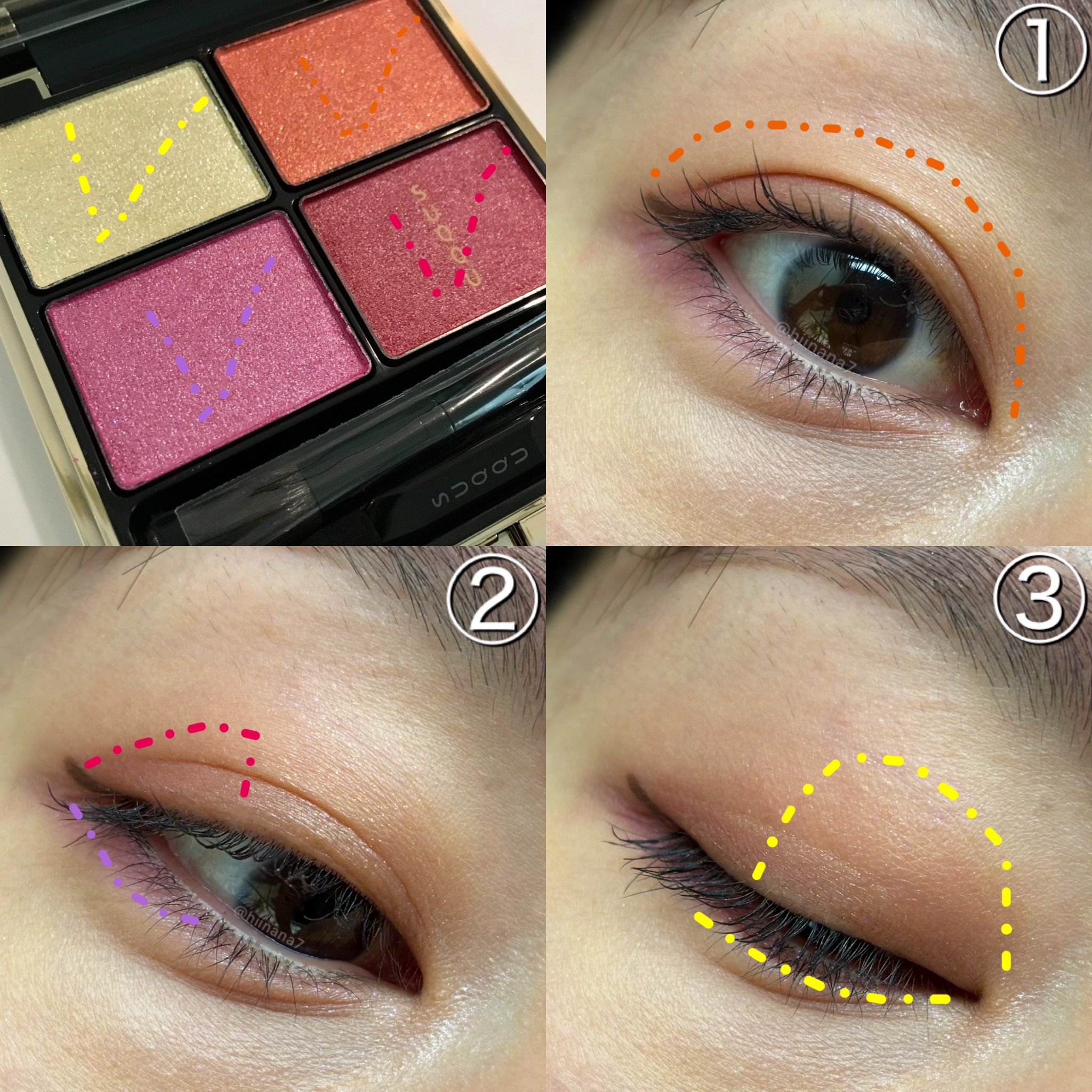 可愛すぎて飛び上がる案件❣️ DELICESはフランス語で、意味は無上の喜び。春が来た喜びを表現してるようなパレット🥰 全体的に発色弱めで透け感を楽しむようなパレット。初めに右下のイエローをベースにしても良いとのこと💕 左上のパープルを下目尻に入れたら透明感爆上がりでめちゃんこ可愛かった😍 パステルカラーのメイクに抵抗がある人でも、これなら大人なオシャレパステルメイクが出来るからオススメ‼️ 本当に買って良かった🥰 この上無き幸せ💕 これこそDELICES💐