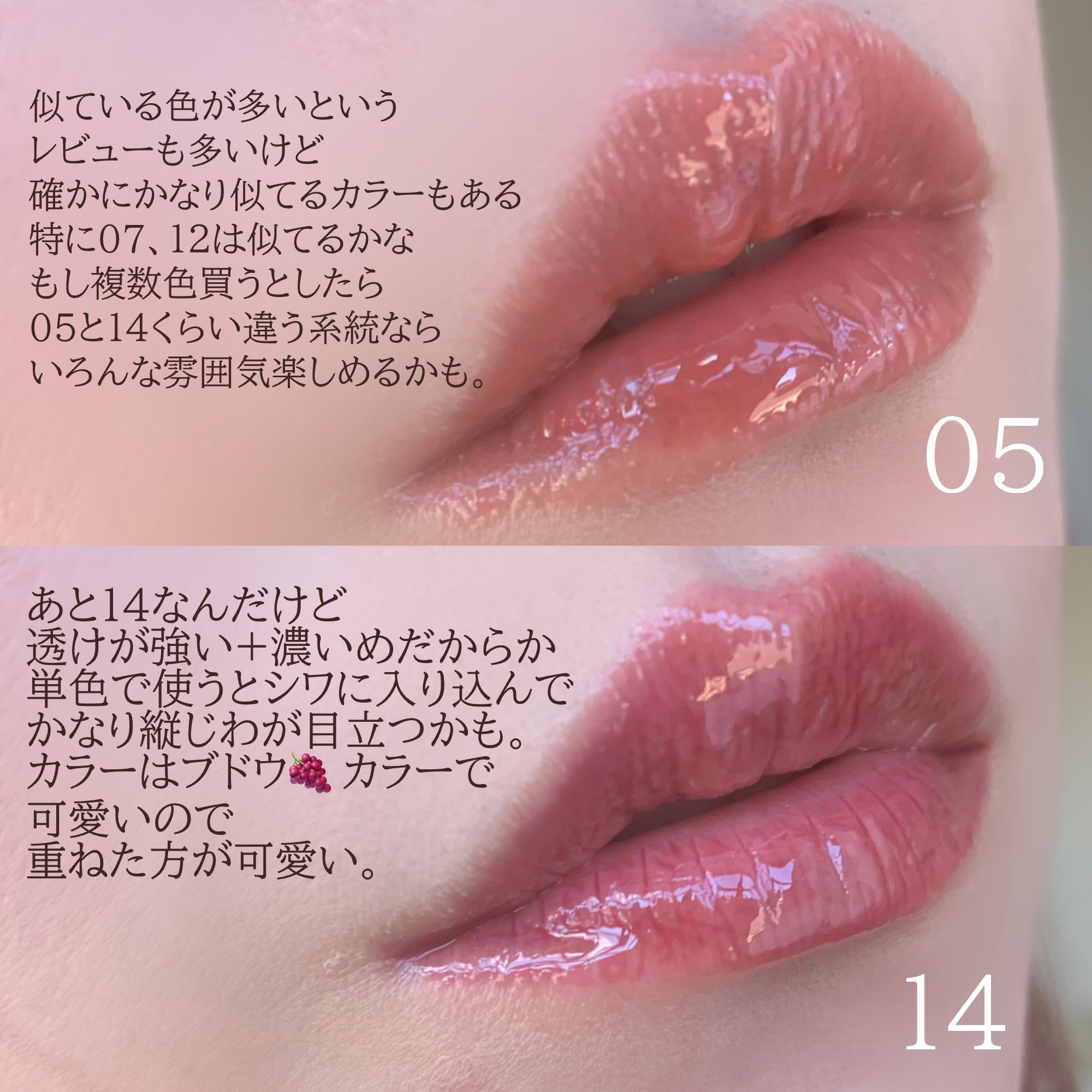 - <01 コーラルジュース> ハイドロジェネイテッドポリイソブテン、ジアイソステアリルマレート、カプリーリル/カプリルトリグリセリド、ポリグリセリル-2トライイソステアレート、ラズベリーシードオイル、トコフェリルアセテート、プロパンジオールエステル、ヒマワリ種子油、オリーブ果実油、ホホバ種子油、ブドウ種子油、蓮の花エキス、ヤグルマギク花エキス、セイヨウニワトコ花エキス、マグワ根皮エキス、デキストリンパルミテート、シリカジメチルシリレート、ジメチルシリル化シリカ、ポリグリセリル-2トリイソステアレート、精製水、グリセリン、スクワラン、ジパルミトイルヒドロキシプロリン、テトラヒドロジフェルロイルメタン、ポタシウムベンゾエート、香料、リナロール、酸化チタン (CI 77891)、黄色酸化鉄 (CI 19140)、赤色酸化鉄 (CI 77492)、赤色202号 (CI 15850)、赤色104号の(1) (CI 45410)、黄色5号 (CI 15985) <02 ベアポメロ> ハイドロジェネイテッドポリイソブテン、ジアイソステアリルマレート、カプリーリル/カプリルトリグリセリド、ポリグリセリル-2トライイソステアレート、ラズベリーシードオイル、トコフェリルアセテート、プロパンジオールエステル、ヒマワリ種子油、オリーブ果実油、ホホバ種子油、ブドウ種子油、蓮の花エキス、ヤグルマギク花エキス、セイヨウニワトコ花エキス、マグワ根皮エキス、デキストリンパルミテート、シリカジメチルシリレート、ジメチルシリル化シリカ、ポリグリセリル-2トリイソステアレート、精製水、グリセリン、スクワラン、ジパルミトイルヒドロキシプロリン、テトラヒドロジフェルロイルメタン、ポタシウムベンゾエート、香料、リナロール、酸化チタン (CI 77891)、黄色酸化鉄 (CI 19140)、赤色酸化鉄 (CI 77492)、赤色202号 (CI 15850)、赤色104号の(1) (CI 45410)、黄色5号 (CI 15985) <03 ハニーピーチ> ハイドロジェネイテッドポリイソブテン、ジアイソステアリルマレート、カプリーリル/カプリルトリグリセリド、ポリグリセリル-2トライイソステアレート、ラズベリーシードオイル、トコフェリルアセテート、プロパンジオールエステル、ヒマワリ種子油、オリーブ果実油、ホホバ種子油、ブドウ種子油、蓮の花エキス、ヤグルマギク花エキス、セイヨウニワトコ花エキス、マグワ根皮エキス、デキストリンパルミテート、シリカジメチルシリレート、ジメチルシリル化シリカ、ポリグリセリル-2トリイソステアレート、精製水、グリセリン、スクワラン、ジパルミトイルヒドロキシプロリン、テトラヒドロジフェルロイルメタン、ポタシウムベンゾエート、香料、リナロール、酸化チタン (CI 77891)、黄色酸化鉄 (CI 19140)、赤色酸化鉄 (CI 77492)、赤色202号 (CI 15850)、赤色104号の(1) (CI 45410)、黄色5号 (CI 15985) <04 アップルバイト> ハイドロジェネイテッドポリイソブテン、ジアイソステアリルマレート、カプリーリル/カプリルトリグリセリド、ポリグリセリル-2トライイソステアレート、ラズベリーシードオイル、トコフェリルアセテート、プロパンジオールエステル、ヒマワリ種子油、オリーブ果実油、ホホバ種子油、ブドウ種子油、蓮の花エキス、ヤグルマギク花エキス、セイヨウニワトコ花エキス、マグワ根皮エキス、デキストリンパルミテート、シリカジメチルシリレート、ジメチルシリル化シリカ、ポリグリセリル-2トリイソステアレート、精製水、グリセリン、スクワラン、ジパルミトイルヒドロキシプロリン、テトラヒドロジフェルロイルメタン、ポタシウムベンゾエート、香料、リナロール、酸化チタン (CI 77891)、黄色酸化鉄 (CI 19140)、赤色酸化鉄 (CI 77492)、赤色202号 (CI 15850)、赤色104号の(1) (CI 45410)、黄色5号 (CI 15985) <05 キャラメルドリズル> ハイドロジェネイテッドポリイソブテン、ジアイソステアリルマレート、カプリーリル/カプリルトリグリセリド、ポリグリセリル-2トライイソステアレート、ラズベリーシードオイル、トコフェリルアセテート、プロパンジオールエステル、ヒマワリ種子油、オリーブ果実油、ホホバ種子油、ブドウ種子油、蓮の花エキス、ヤグルマギク花エキス、セイヨウニワトコ花エキス、マグワ根皮エキス、デキストリンパルミテート、シリカジメチルシリレート、ジメチルシリル化シリカ、ポリグリセリル-2トリイソステアレート、精製水、グリセリン、スクワラン、ジパルミトイルヒドロキシプロリン、テトラヒドロジフェルロイルメタン、ポタシウムベンゾエート、香料、リナロール、酸化チタン (CI 77891)、黄色酸化鉄 (CI 19140)、赤色酸化鉄 (CI 77492)、赤色202号 (CI 15850)、赤色104号の(1) (CI 45410)、黄色5号 (CI 15985) <06 フェードローズ> ハイドロジェネイテッドポリイソブテン、ジアイソステアリルマレート、カプリーリル/カプリルトリグリセリド、ポリグリセリル-2トライイソステアレート、ラズベリーシードオイル、トコフェリルアセテート、プロパンジオールエステル、ヒマワリ種子油、オリーブ果実油、ホホバ種子油、ブドウ種子油、