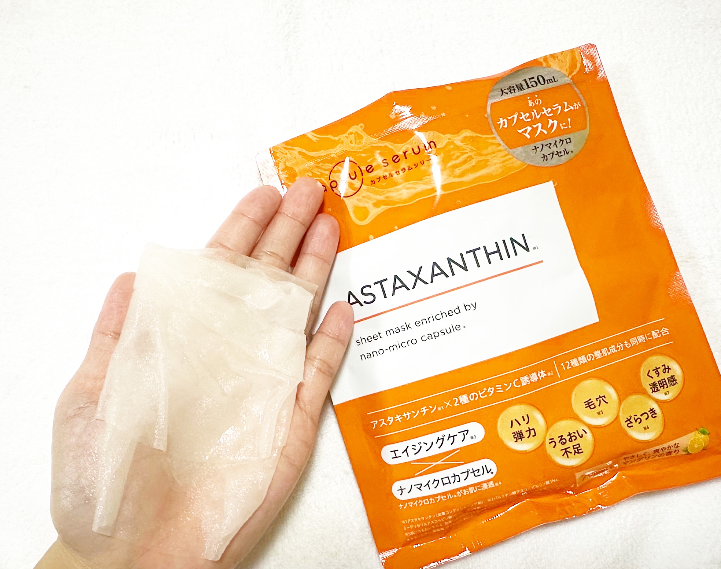 最新テクノロジーであのカプセルセラムがマスクに✨ 5つの悩みをカバー!集中エイジングケア ナノマイクロカプセル×2種のビタミンC誘導体配合 血管を若返らせる効果があると言われているアスタキサンチンがアプローチ ̖́- みずみずしく美容液たっぷり 薄めのシートマスクがピタッと密着しっとりもちもちな肌へ♡