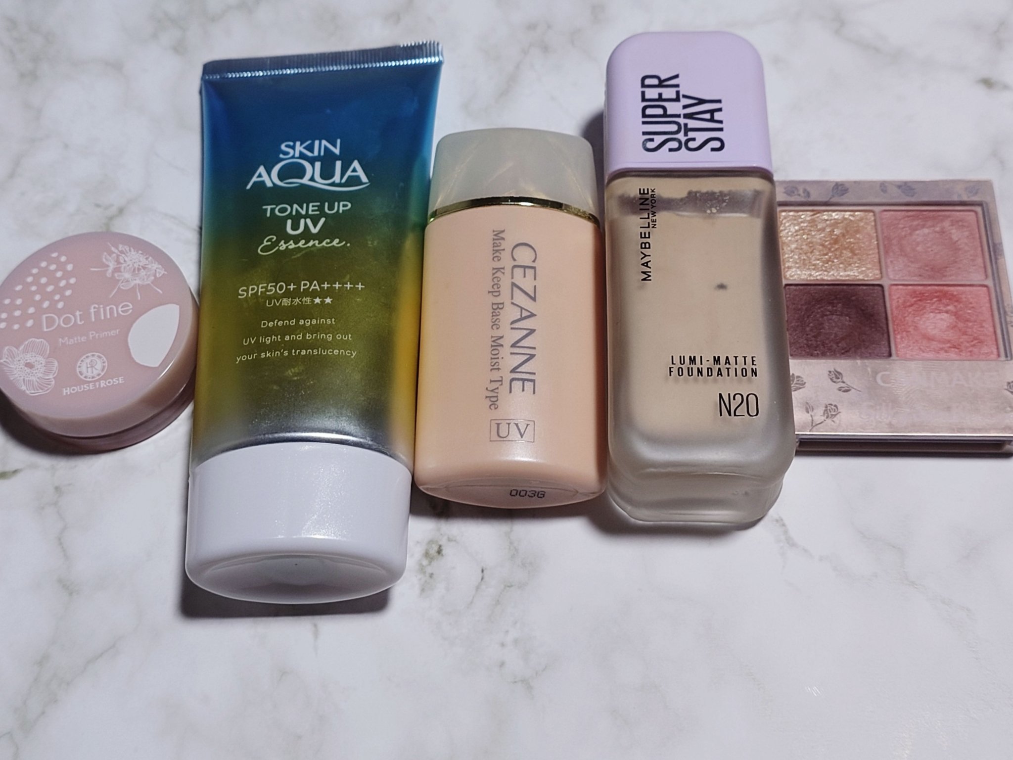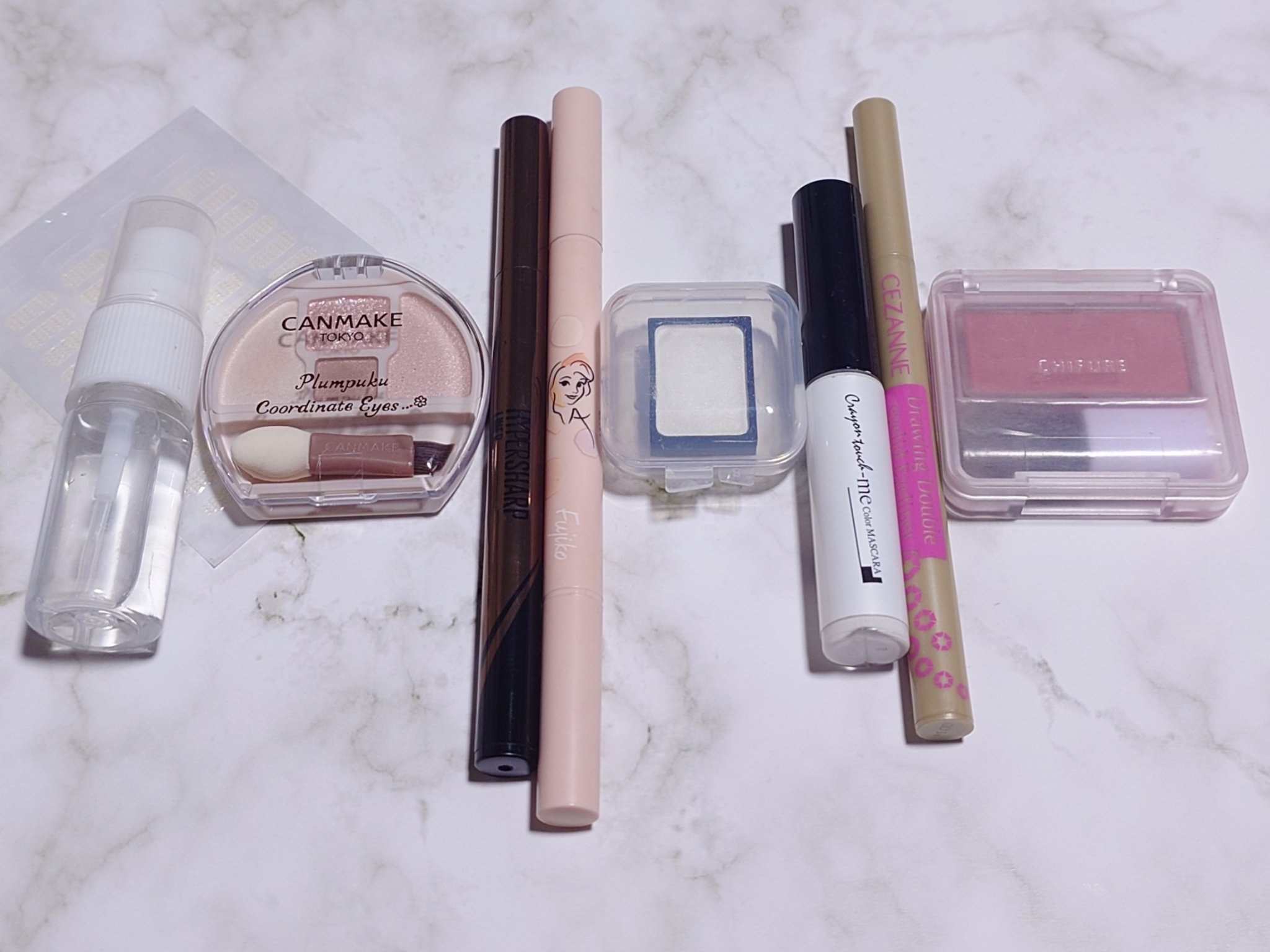 無印良品 UVベースコントロールカラー SPF 50+・PA+++ 旧 ピンク 顔全体にムラなく塗り広げる。 MAYBELLINE NEW YORK SPステイ ルミマット リキッド ファンデーション C20 よく振ってから顔全体にムラなく塗り広げる。 K-パレット リアルラスティングアイライナー24hWP 目尻から少し長めにかく。
