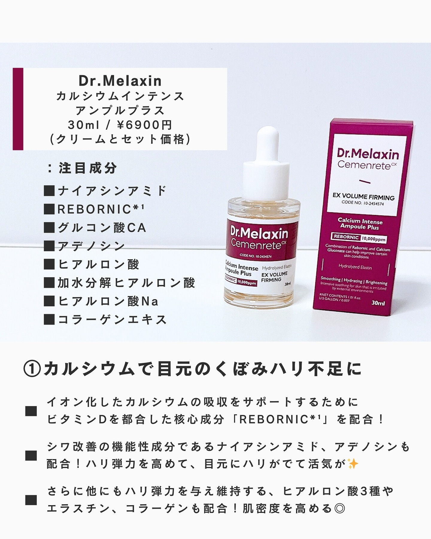 カルシウムで肌の骨組みからハリ・弾力チャージ 目元の皮膚は他の部位に比べ5倍も薄く、1番早くハリを失い、老化してしまうため、早めのケアが大事 特化型成分REBORNIC(リボーニック)がカルシウムの浸透力を高め抜け出さないようホールド ぷりっと感がありました。伸びが良く、馴染みも良かったです。吸い付くようなペタッと感はありますが、もっちり仕上がりで保湿されました。