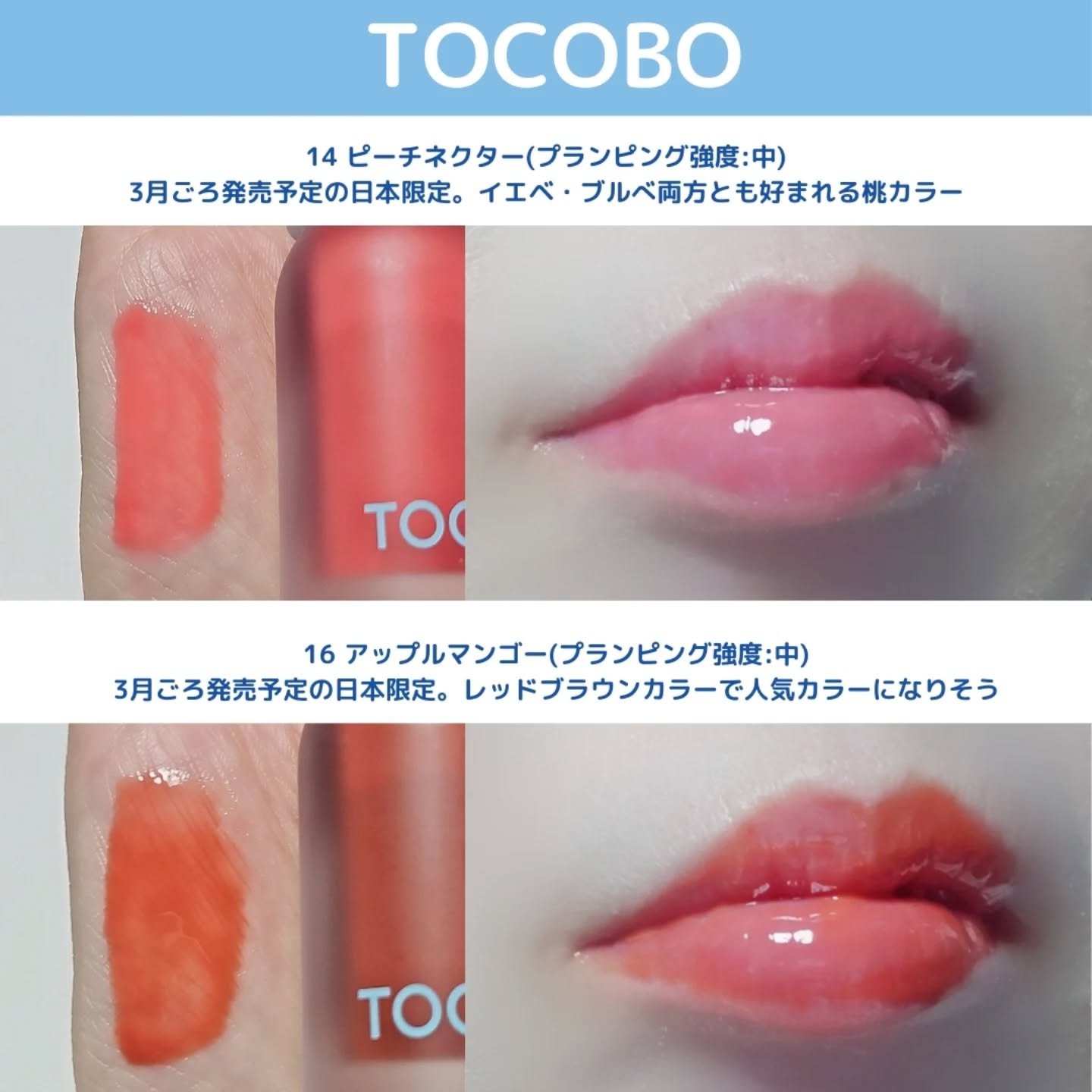 ジューシーベリープランピングリップオイル♡ 3月発売予定で日本限定カラーも登場🍑 ぷるぷるのビー玉リップ✨️ - 11ハニーレモン:ラメ入りで可愛い🍋 プランピングMAXタイプ 慣れるまで結構痛い😣 1番透け感のないタイプで、ぷるんと桃唇に✨️ - 16アップルマンゴー:こちらも3月発売予定の日本限定カラー🥭