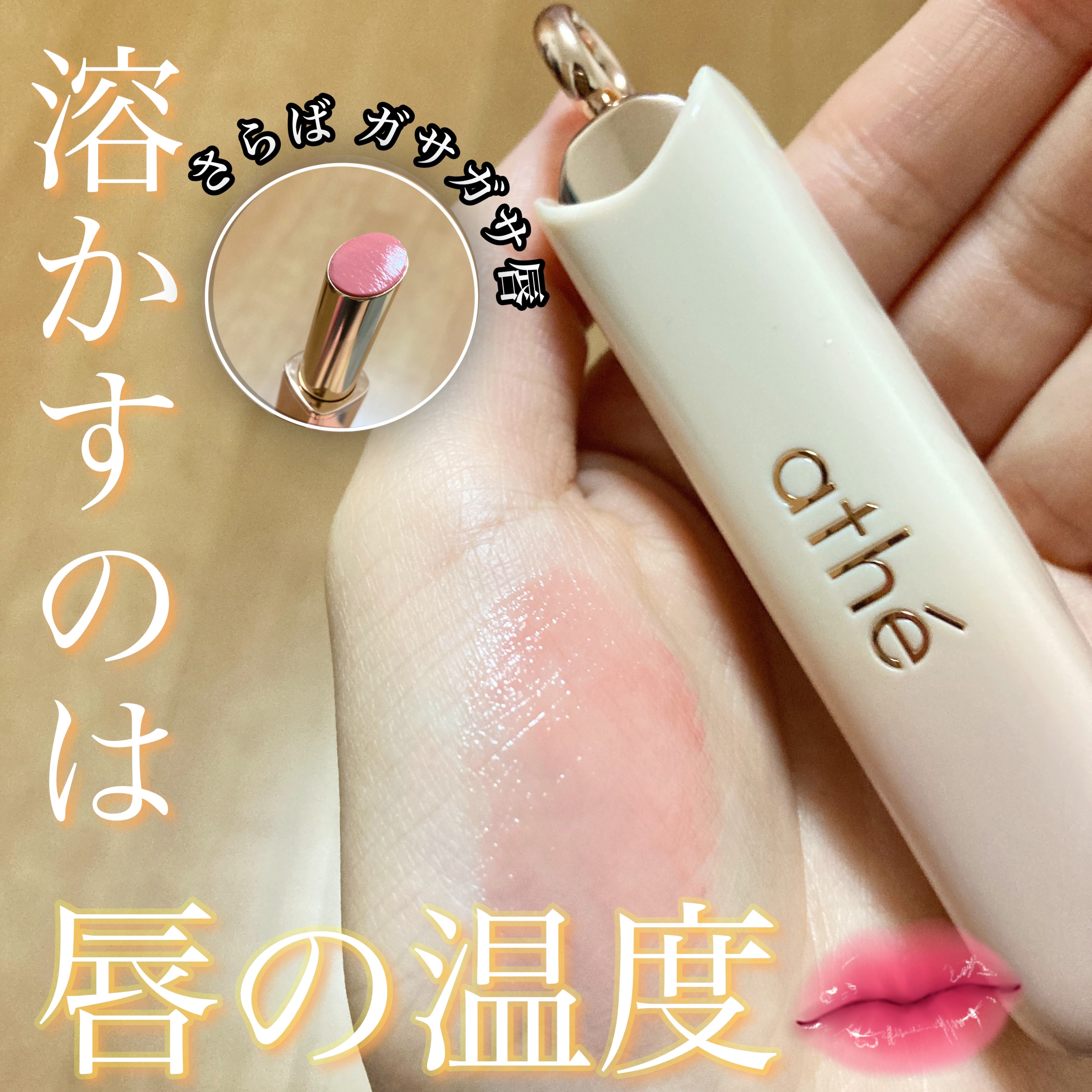 - athéからうるおい重視のヴィーガンリップ登場。コーティングしたようなぷるんとツヤのある唇に演出します。 #スリーピングマスクのような保湿感 #ふっくら*1&つやつや #ボリューム感*1演出 ☑ラッピング力:手のひらの温度(31-32℃)よりも低い唇の温度(28℃)でも溶けるテクスチャーにこだわり、ふっくら*1としたツヤ感。 ☑3色のカラー展開:1色でも使いやすく、重ね塗りでもより可愛いカラーに仕上げました。 ☑全体の80%以上が保湿成分:コラーゲン*2、ペプチド*2でハリ感を出し、スクワラン*2、セラミド*2で保湿。 ☑使用感:唇の温度で柔らかく溶け、角質をケアしながら唇にハリとツヤをプラス。 ☑こだわり容器:リップグローイバームはやわらかいテクスチャーのため、少しずつゆっくり繰り出せる容器に設計。 先端が丸いリング状になっており、お好みのチャーム等を付けてアレンジできるのも特徴。 マグネットで閉まる設計で容器が割れやすい問題にも対処しました。 *1 メイクアップ効果による *2 配合目的:保湿