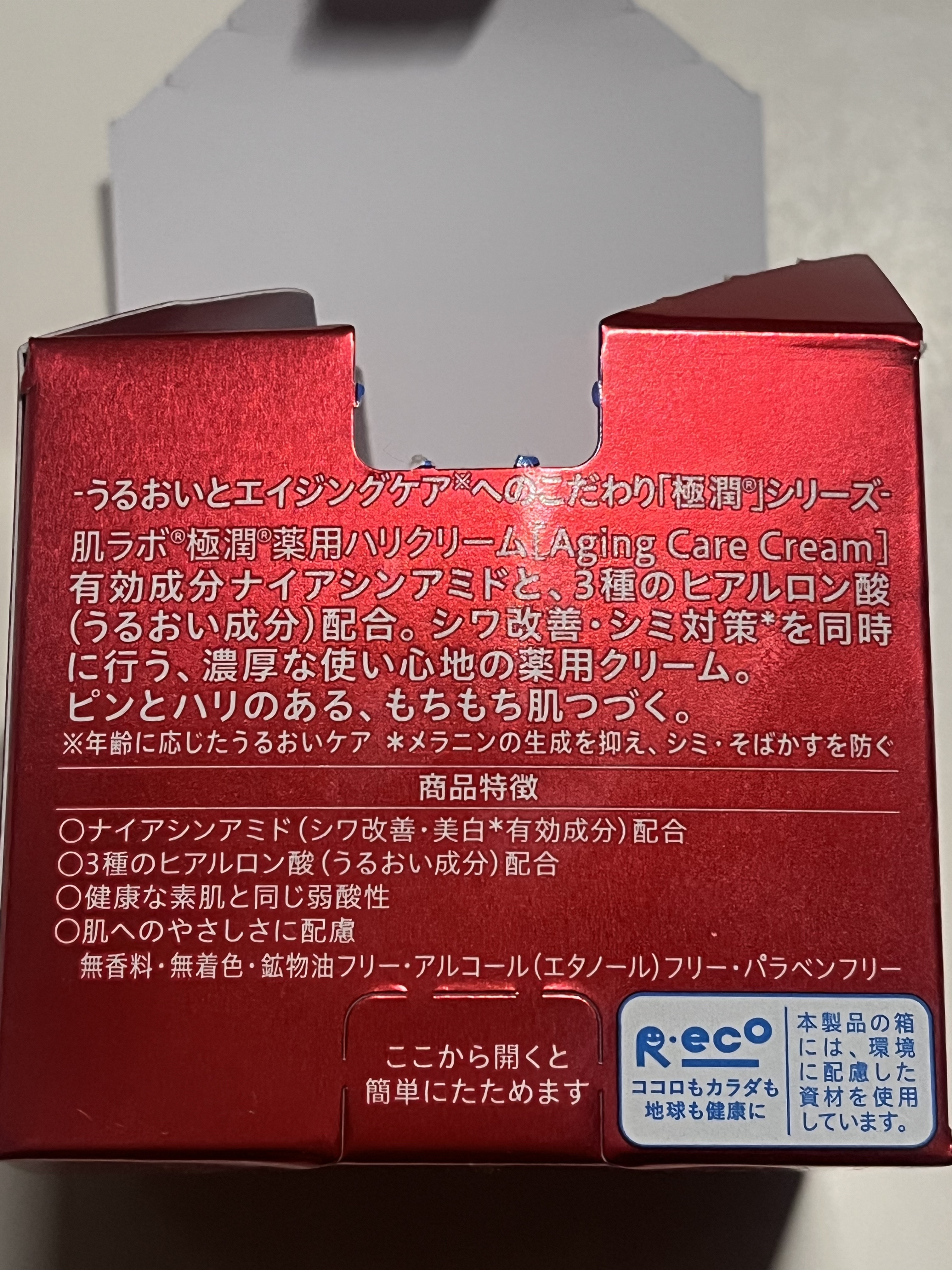 - <極潤 薬用ハリクリーム> ナイアシンアミド、ヒアルロン酸Na-2、加水分解ヒアルロン酸、アセチル化ヒアルロン酸ナトリウム*、アセチルグルコサミン、オウバクエキス、シア脂、d-δ-トコフェロール、濃グリセリン、BG、硬化油、トリ(カプリル・カプリン酸)グリセリル、α-オレフィンオリゴマー、1,2-ペンタンジオール、トリイソステアリン酸ポリオキシエチレングリセリル、イソステアリン酸POE(20)ソルビタン、ポリオキシエチレンベヘニルエーテル、ジメチコン、プルラン、カルボキシビニルポリマー、TEA、エデト酸塩、ベヘニルアルコール、ステアリルアルコール、フェノキシエタノール
