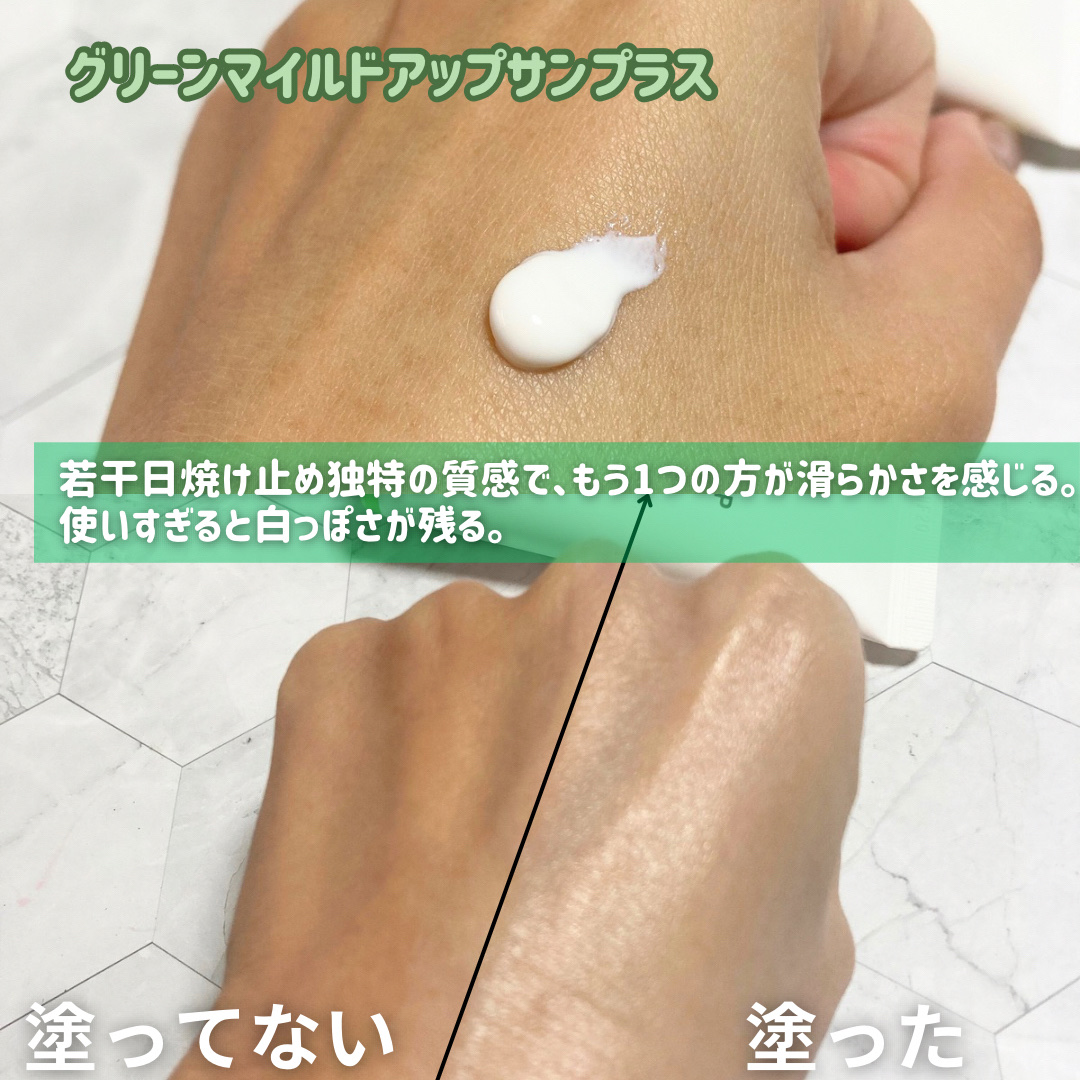 グリーンマイルドアップサンプラスは、ベタつく日焼け止めが苦手な方に特におすすめです。 ブライトニングアップサンプラスは、日焼け止めも化粧下地も一本で済ませたい人に特におすすめしたいです。 どちらの日焼け止めもみずみずしくて伸びのいいテクスチャーです。