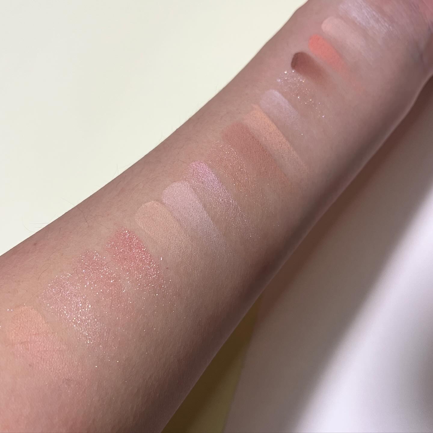 チークは大人女子でも使いやすいカラーだし粉質もすごい良い! ハイライトはぷにぷにしてる。 ラメが細かくてほんと綺麗。 右のピンクのハイライトはチークハイライトとして使うのかな?瞼にも使えると書いてあるけど。