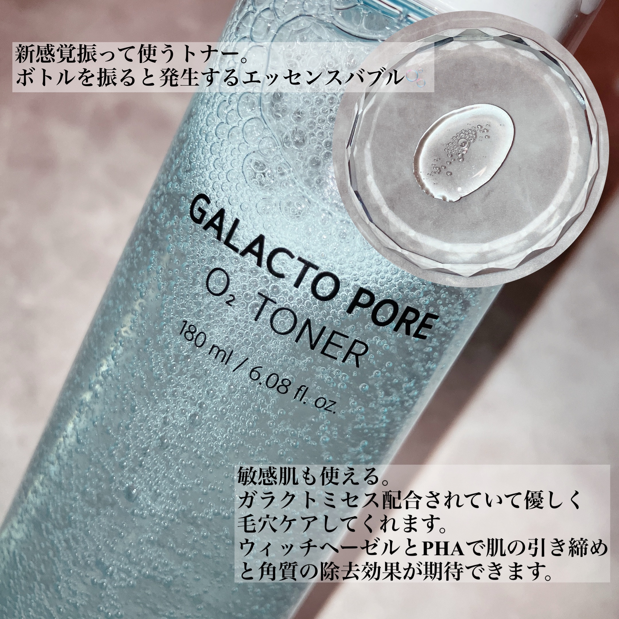 - ガラクトシリーズより新しく登場したガラクトポアオーツー(O2)トナー。 新感覚の酸素を含んだバブルエッセンスが毛穴に詰まった古い角質や過剰な皮脂をケアして肌のキメを整え、イキイキとした肌印象に導きます。 敏感なお肌にもやさしい使い心地で毛穴ケアが可能です。 しっとりべたつきのないテクスチャーで朝晩使用でき、さらに乾燥による毛穴目立ちを防ぐため肌表面に潤いを与えます。 皮膚低刺激テスト完了済*。敏感肌の方もご使用いただけます。 <特長成分> ガラクトミセス発酵ろ過物 : 肌にやさしい使い心地でうるおいを与える。(保湿成分) ウィッチヘーゼル : 肌を引き締めなめらかな印象をサポート。(整肌成分) PHA : 角質ケア成分配合。(角質柔軟成分) <テクスチャー&香り> - テクスチャー しっとり伸びやすく肌になじみやすいテクスチャー - 香り シトラスハーブ系 *全ての方に皮膚刺激が発生しないということではありません