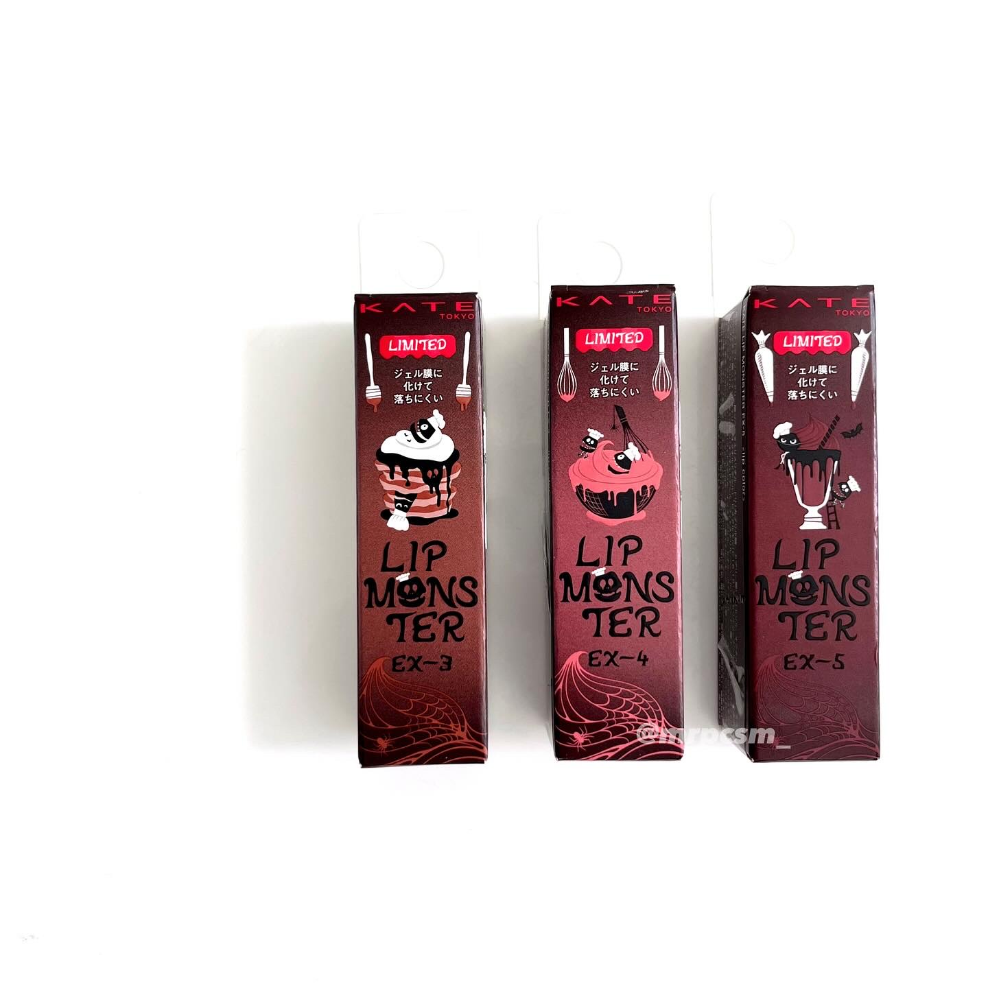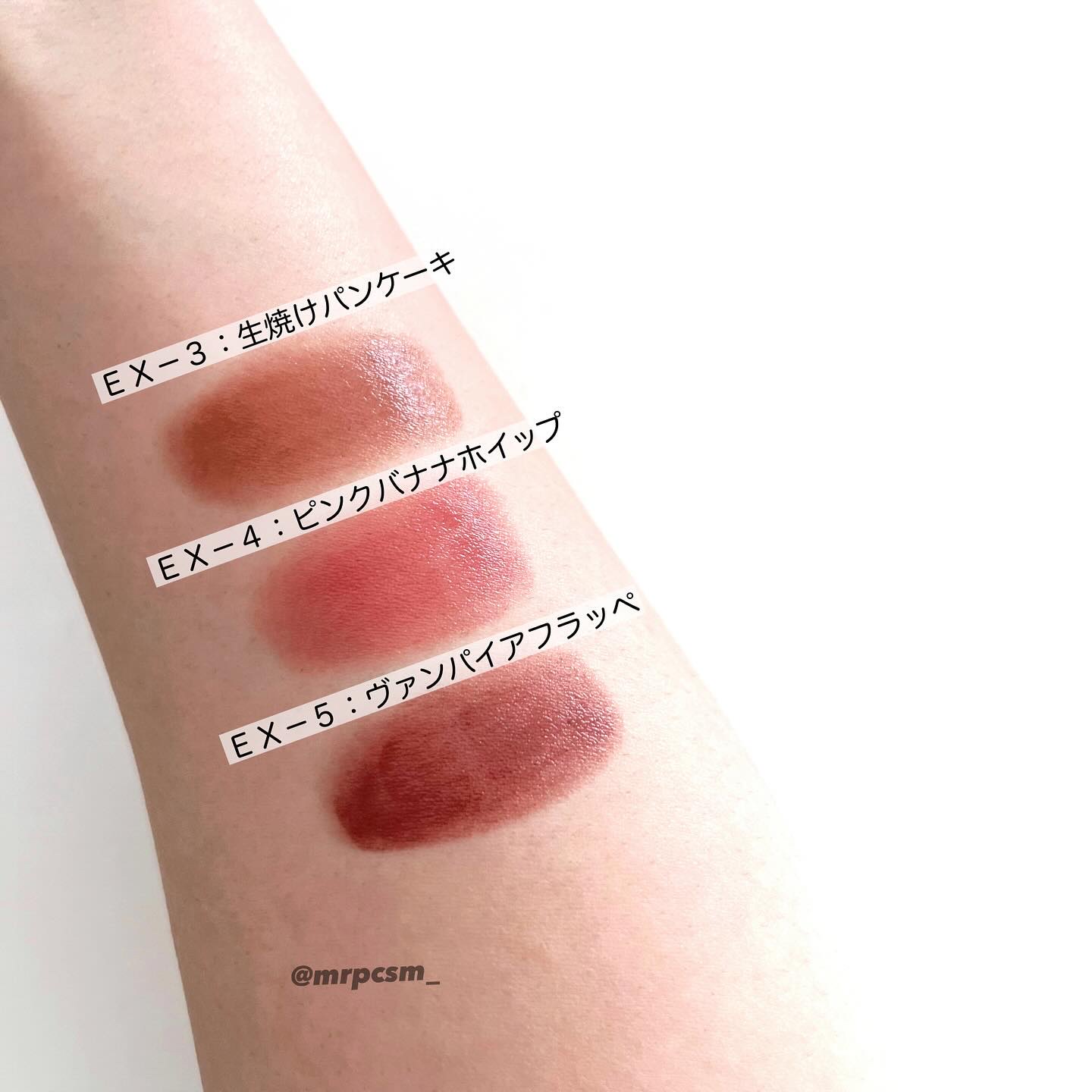 1月25日発売のリップモンスターの限定色。絶対欲しいと思っていたけど先行予約販売を逃して1月21日にMyKaoMallで一足先に購入。 EX-3生焼けパンケーキはクリーミーベージュ系、EX-4ピンクバナナホイップはクリーミーピンク系、EX-5ヴァンパイアフラッペはクリーミーモーヴ系のカラーで個人的に難しい色もあるかなと思ったけど肌馴染みがいいので意外と使いやすい。 購入できて良かった♡