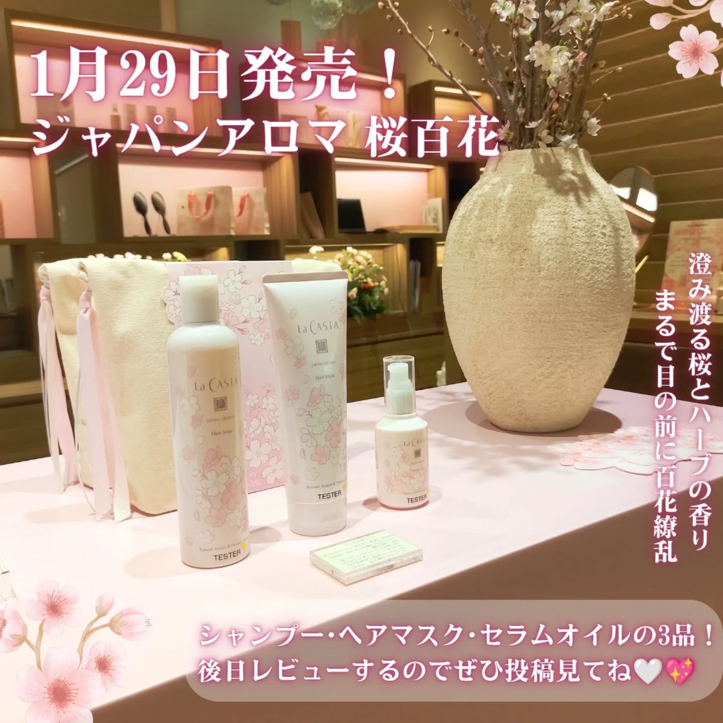 - 〈数量限定〉 ※取扱店舗限定(ラ・カスタ直営店舗、公式オンラインショップ、一部取扱店舗) 髪も肌も心も、艶やかで晴れやかな春を迎える準備を セット内容 ●ラ・カスタ ジャパンアロマ ヘアソープ HY〈シャンプー〉 300ml ●ラ・カスタ ジャパンアロマ ヘアマスク HY〈ヘアトリートメント〉 230g ●ラ・カスタ ジャパンアロマ セラムオイル 桜百花〈ヘア&ボディ用オイル〉 80ml ●オリジナルポーチ(オーガニックコットン)(W250×H260×D65mm) ●オリジナルショッパー 2025年1月22日(水)よりラ・カスタ直営店舗、公式オンラインショップ、一部取扱店舗にて先行限定発売