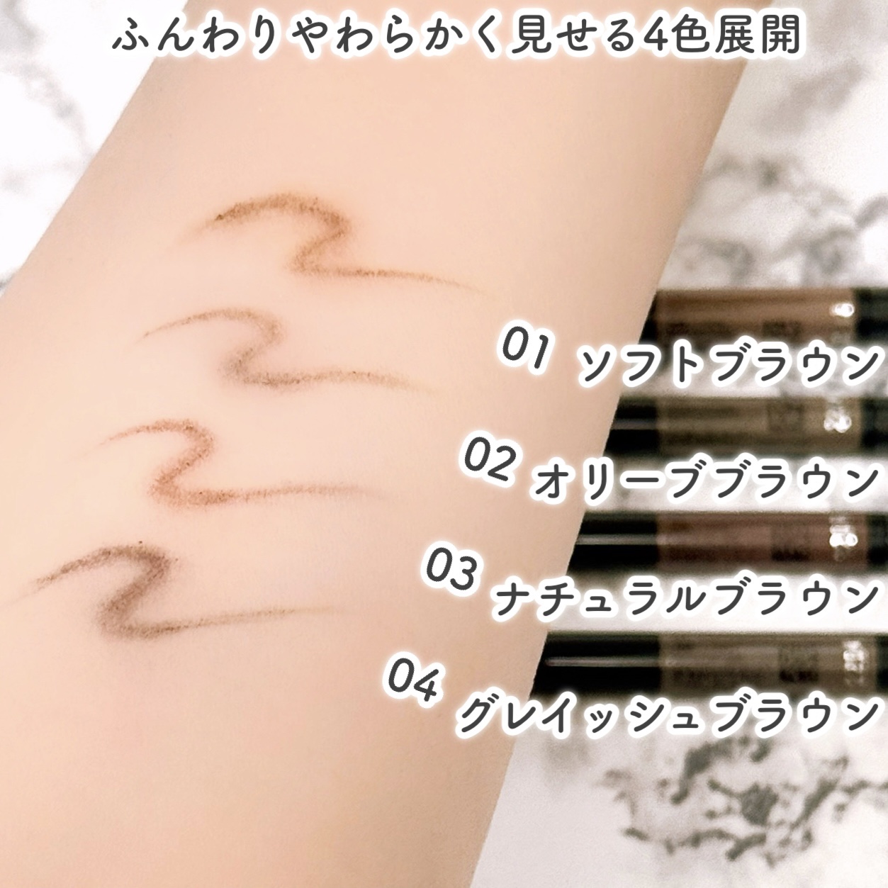 - <01 ソフトブラウン> マイカ、ステアリン酸、モクロウ、水添ヒマシ油、ダイマージリノール酸(フィトステリル/イソステアリル/セチル/ステアリル/ベヘニル)、トリ(カプリル酸/カプリン酸)グリセリル、セスキイソステアリン酸ソルビタン、水酸化Al、トコフェロール、(+/-)酸化チタン、酸化鉄 <02 オリーブブラウン> マイカ、ステアリン酸、モクロウ、水添ヒマシ油、ダイマージリノール酸(フィトステリル/イソステアリル/セチル/ステアリル/ベヘニル)、トリ(カプリル酸/カプリン酸)グリセリル、セスキイソステアリン酸ソルビタン、水酸化Al、トコフェロール、(+/-)酸化チタン、酸化鉄 <03 ナチュラルブラウン> マイカ、ステアリン酸、モクロウ、水添ヒマシ油、ダイマージリノール酸(フィトステリル/イソステアリル/セチル/ステアリル/ベヘニル)、トリ(カプリル酸/カプリン酸)グリセリル、セスキイソステアリン酸ソルビタン、水酸化Al、トコフェロール、(+/-)酸化チタン、酸化鉄 <04 グレイッシュブラウン> マイカ、ステアリン酸、モクロウ、水添ヒマシ油、ダイマージリノール酸(フィトステリル/イソステアリル/セチル/ステアリル/ベヘニル)、トリ(カプリル酸/カプリン酸)グリセリル、セスキイソステアリン酸ソルビタン、水酸化Al、トコフェロール、(+/-)酸化チタン、酸化鉄