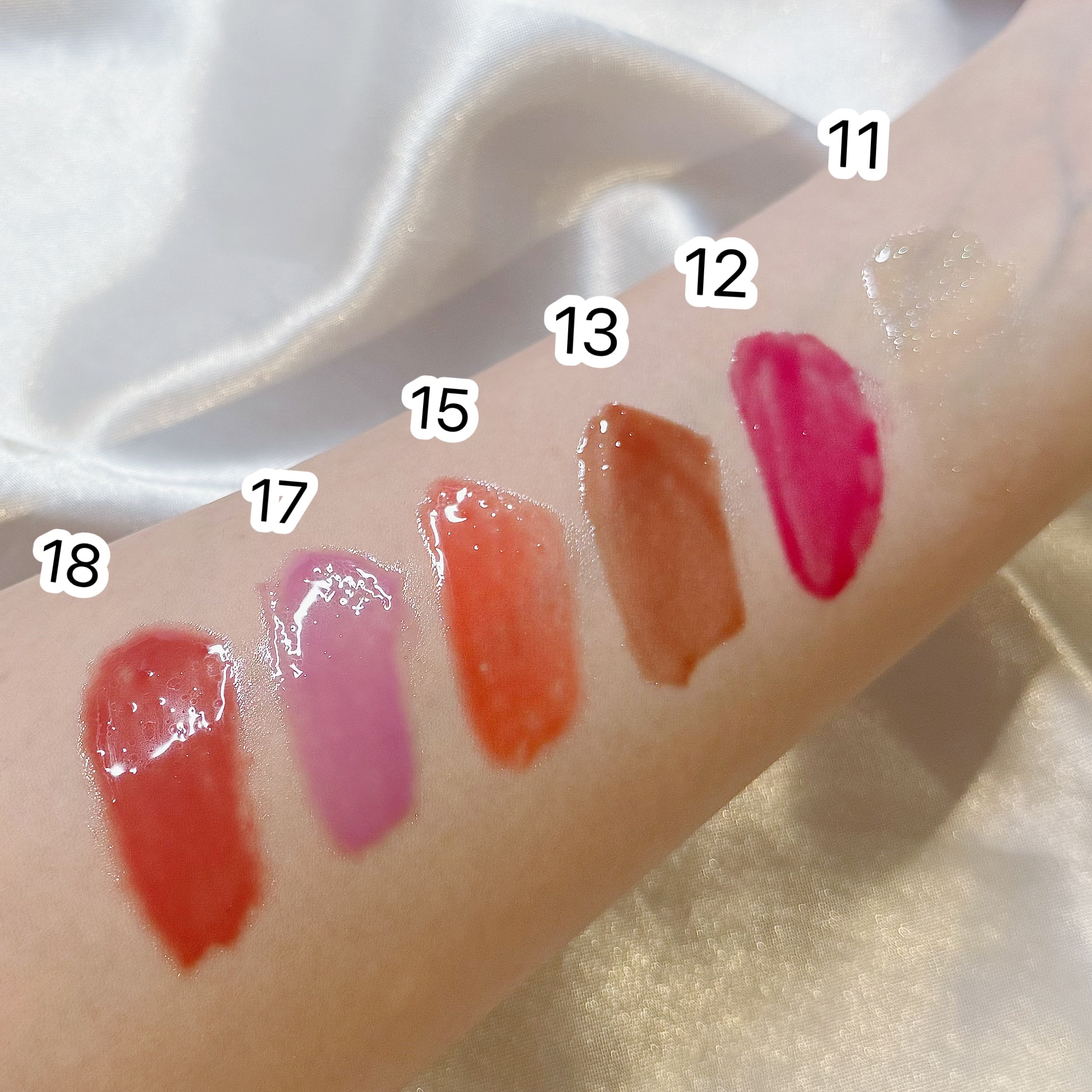 どの色味もとても艶が出て可愛くて、大好きです! ジューシーベリー プランピング リップオイル ★ 左から 11ハニーレモン 12チェリーエード 13チョコベリー 14ピーチネクター 15コーラルソーダ 16アップルマンゴー 17ベリーミルク 18コージーピンク ★