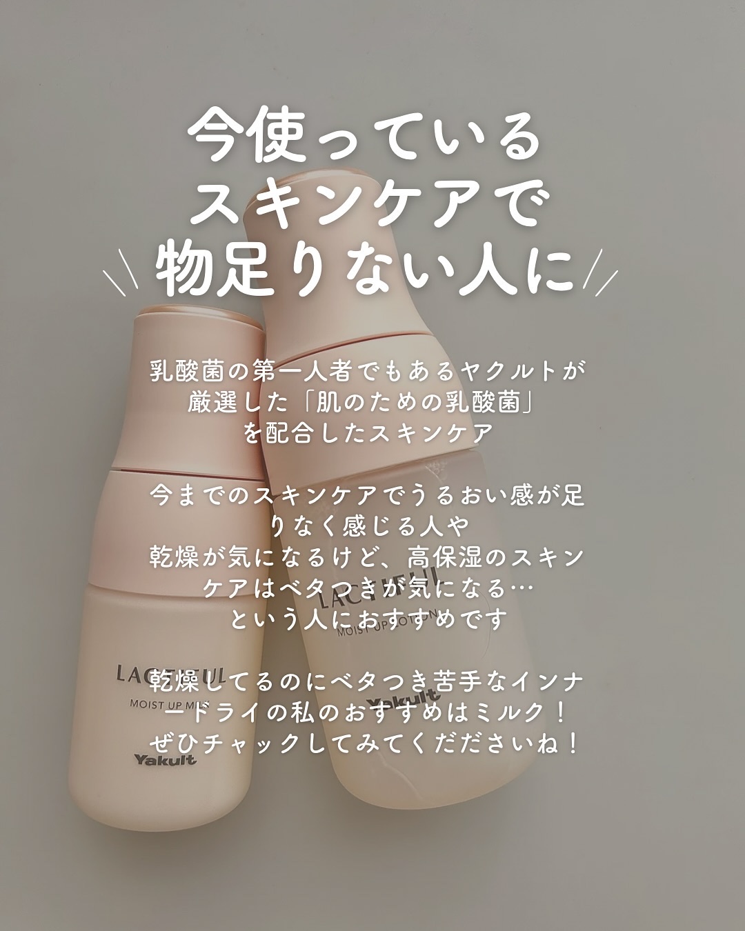 ヤクルト独自の研究から生まれた乳酸菌由来の保湿成分「高浸透乳酸菌エキス*」を配合したスキンケアシリーズ。つけた瞬間から吸い込まれるように肌奥*1に浸透。 思わず触りたくなるようなもっちりとしたうるおいが広がる化粧水。肌に似たうるおい成分がつけた瞬間からぐんぐん浸透*1。 乳酸菌*5ヴェールが肌全体を包み込み、うるおいにフタをするから、肌のもっちり感が続きます。