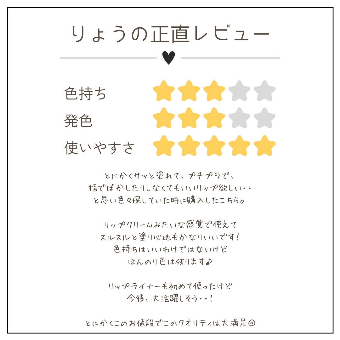 | 口紅・グロス・リップライナーランキング第149位 | つけ心地滑らかで、スルスル濡れる👍 発色も良い👍 | 詳細を見る | |
