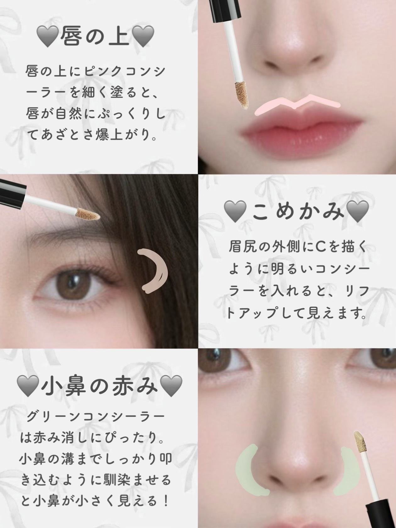 \全部知ってた?/ コンシーラーの使い方10選です🙌🏻 1️⃣目のクマをかくす →コンシーラーの色使いは 小田切ヒロさんを参考にしています! 2️⃣グラデリップをつくる 3️⃣頬こけをかくして輪郭を綺麗に! 4️⃣のっぺり顔→立体顔に! ...