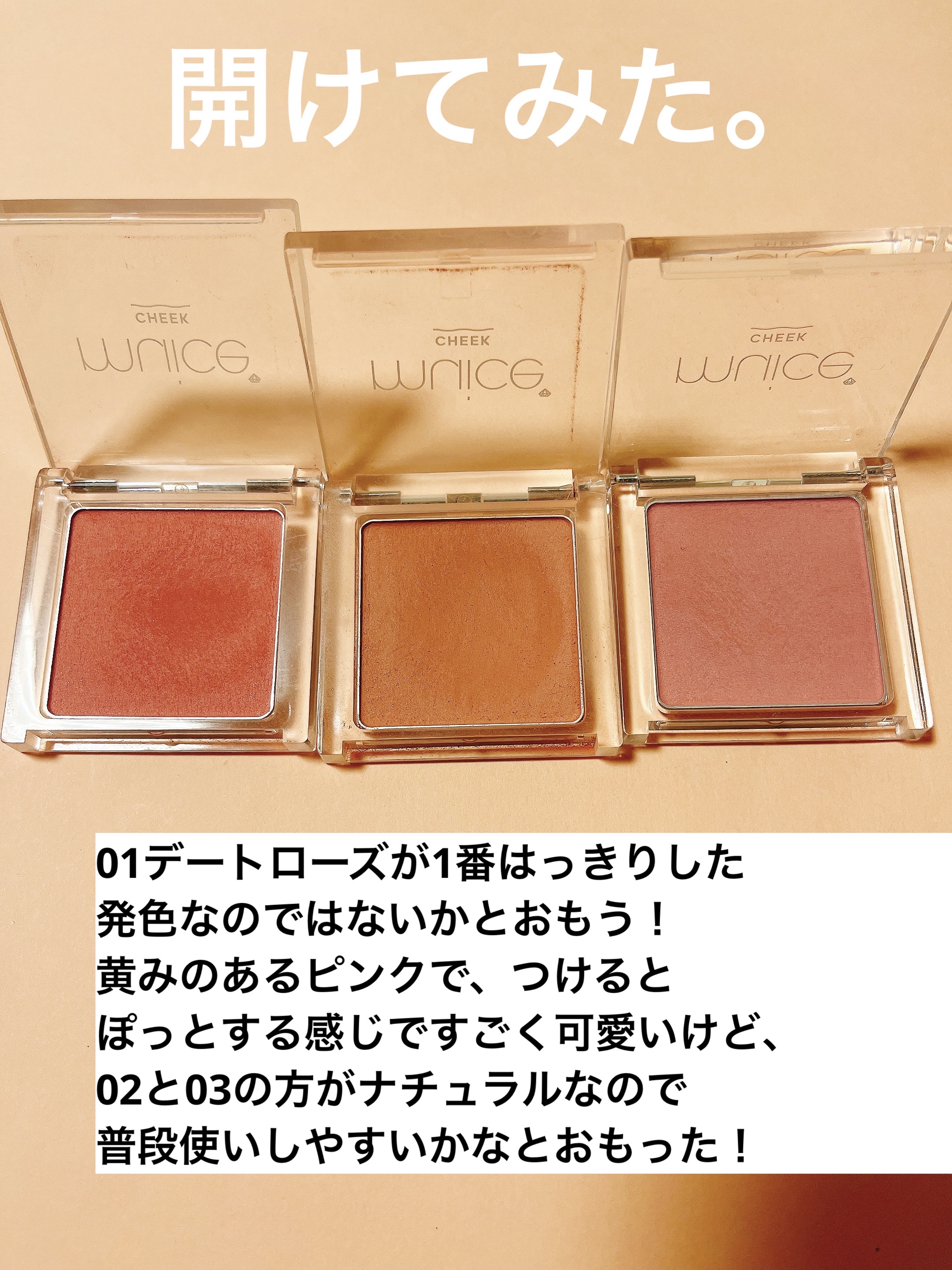 muiceのぽわんチークプチプラで粉質も良く、使いやすいチーク本当に名前の通り、ぽわんと発色する!02ピュアビスケットは肌馴染みのいいオレンジカラーでマットなので普段でも使いやすい!色は付くのにパキッと発色しないから初心者さんでも使いやすいか...
