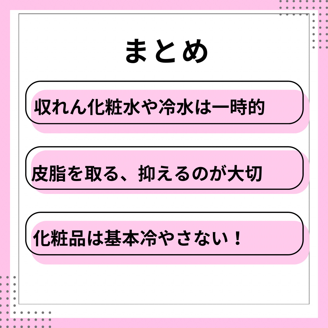 収れん化粧水や冷水は一時的に毛穴を小さくしているだけ! 毛穴を引き締めたり、化粧持ちを良くしたりするもの。 普段のケアで行う! ・皮脂分泌を抑える ・酸化した皮脂を取ること 化粧品は温度変化によって質が下がるものがほとんど! 記載通りの保管を!