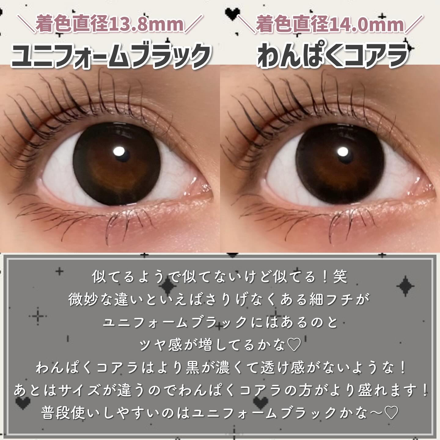 MOLAK #ダズルグレーTOPARDS #グレークォーツ MOLAKはフチしっかりめで比較するとグレーの色味がはっきりしてるかなといった印象で韓国っぽさが出ます🇰🇷🤍 TOPARDSはサイズ感が少し大きい分ふんわり優しい印象でイエベさんでも使いやすいと思います🫡💛 MOLAK #ダズルベージュTOPARDS #パールキャッツアイ MOLAKはグレー同様気持ちフチが濃いめでしっかりしてるのでキリッとした感じに仕上がります!! でもグレーの時とは違って発色はTOPARDSのがしっかり出たかなと思います! ホント比べると!ですがMOLAKの方が馴染みやすいベージュかなと。