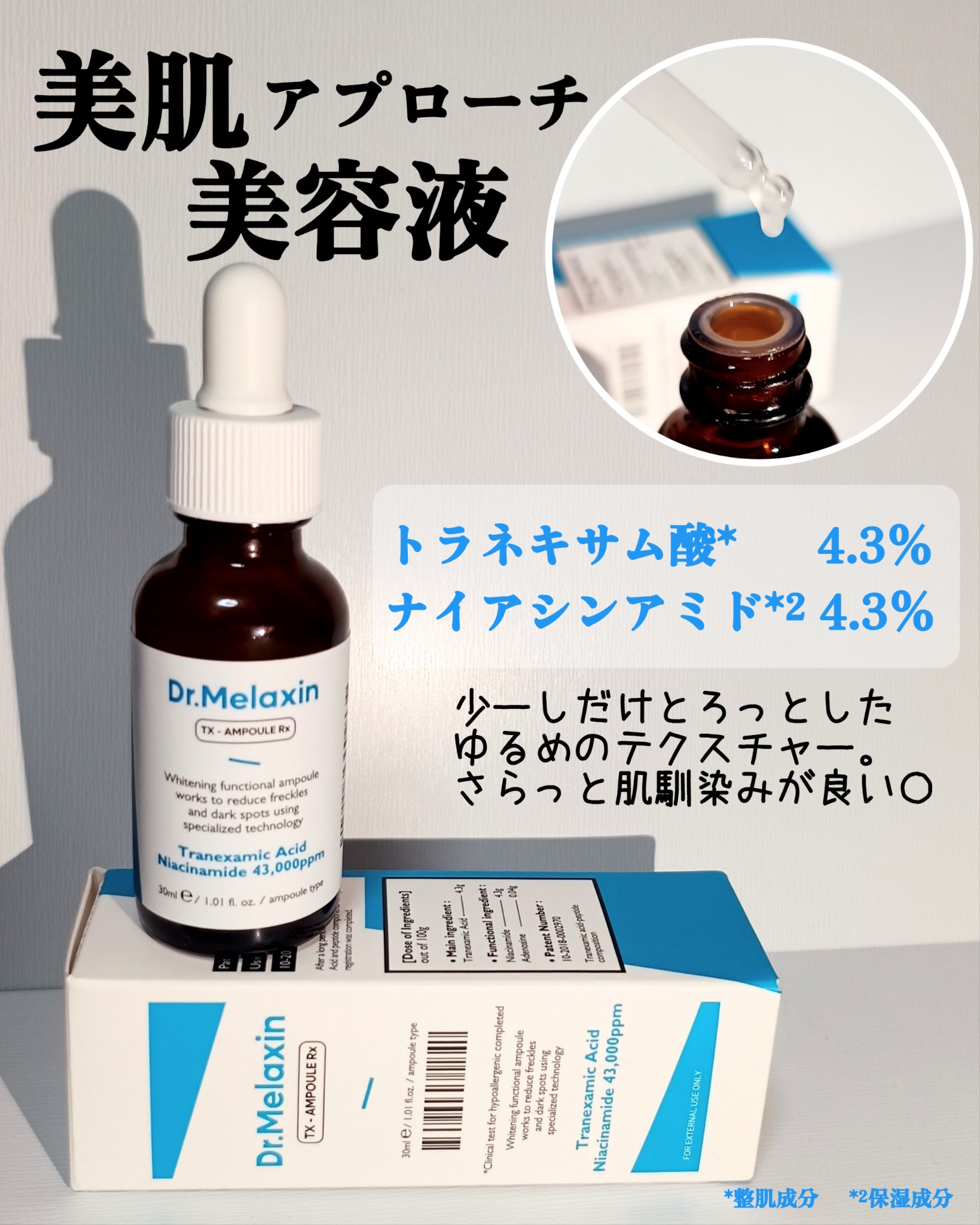 トラネキサム酸ってシミの飲み薬や注射に使われるイメージですよね🤔 それがスキンケアに配合されたアイテムです☺️ ドクターメラクチンだけのリポソーム化したナノトラネキサム酸でより浸透しやすくなってます😌 美白ケアアイテムにありがちな乾燥とかもしなくて、ピリピリするような刺激もなく使いやすかったです😆