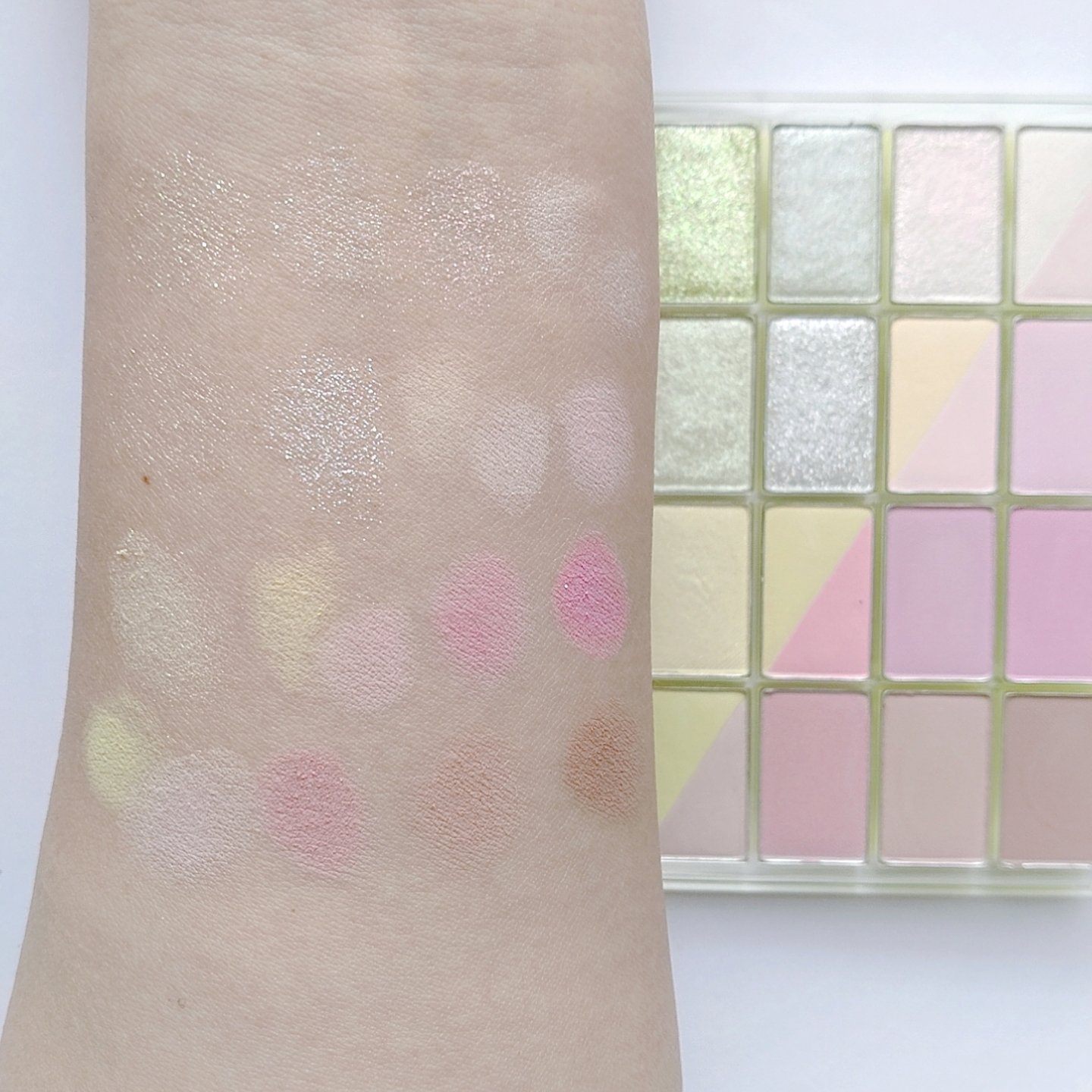 プチプラのクオリティじゃないっ!! 発売前からチェックしていたけれど、ここまで可愛いとは…😆 絶妙カラーで目もとのくすみを飛ばして*明るい印象に🩷 横割りグラデーションでメイクし、立体感をより出したかったので最後に1番左のカラーを上まぶたの真ん中と涙袋にのせています🙆 肌馴染みも良くて粉飛びも感じにくかったです💕 ブラウンの方も店頭に出てたら買おうかな💓