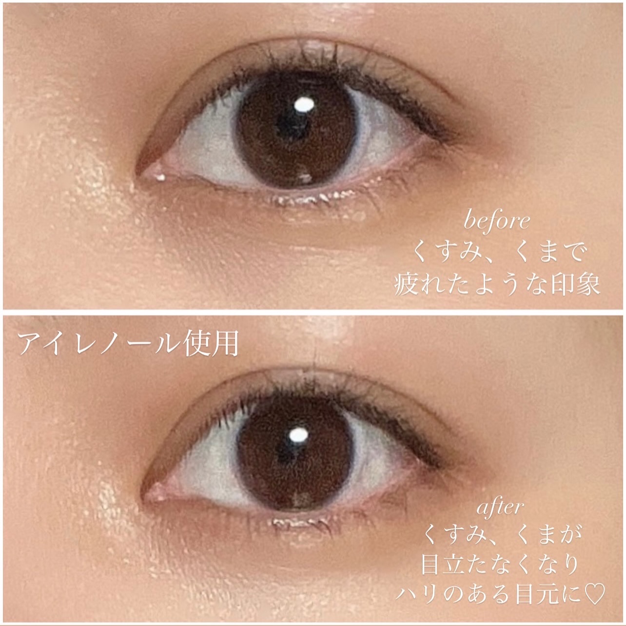 - <アイレノール クマクリーム> 水、シクロペンタシロキサン、グリセリン、ナイアシンアミド、ツボクサ葉エキス、サンゴエキス、パンテノール、イソヘキサデカン、ヒドロキシエチルウレア、ジメチコノール、アラントイン、グリチルリチン酸2K、プロパンジオール、カプリルヒドロキサム酸、香料、オリーブ果実油、酢酸トコフェロール、ホホバ種子油、オレイン酸ソルビタン、アルガニアスピノサ核油、アデノシン、エチルヘキシルグリセリン、プルラン、ヒアルロン酸Na、EDTA-2Na、トリデセス-6、DNA-Na、(アクリル酸グリセリル/アクリル酸)コポリマー、リノール酸グリセリル、ペンチレングリコール、リノレン酸グリセリル、アラキドン酸グリセリル、パルミチン酸レチノール、ラウリン酸K、ピーナッツ油、ヒアルロン酸クロスポリマーNa、トマト果実エキス、ブロッコリーエキス、ケール葉エキス、キャベツ葉エキス、チャ葉エキス、レモン果実エキス、アスパラガスエキス、フラガリアチロエンシス果実エキス、カキ葉エキス、トウガラシ果実エキス、水溶性プロテオグリカン、アスタキサンチン、ヒアルロン酸、トコフェロール、パルミチン酸アスコルビル、酸化チタン、酸化鉄、他 <アイレノール クマクリームS> 水、シクロペンタシロキサン、グリセリン、ナイアシンアミド、ツボクサ葉エキス、サンゴエキス、パンテノール、イソヘキサデカン、ヒドロキシエチルウレア、ジメチコノール、アラントイン、グリチルリチン酸2K、プロパンジオール、カプリルヒドロキサム酸、香料、オリーブ果実油、酢酸トコフェロール、ホホバ種子油、オレイン酸ソルビタン、アルガニアスピノサ核油、アデノシン、エチルヘキシルグリセリン、プルラン、ヒアルロン酸Na、EDTA-2Na、トリデセス-6、DNA-Na、(アクリル酸グリセリル/アクリル酸)コポリマー、リノール酸グリセリル、ペンチレングリコール、リノレン酸グリセリル、アラキドン酸グリセリル、パルミチン酸レチノール、ラウリン酸K、ピーナッツ油、ヒアルロン酸クロスポリマーNa、トマト果実エキス、ブロッコリーエキス、ケール葉エキス、キャベツ葉エキス、チャ葉エキス、レモン果実エキス、アスパラガスエキス、フラガリアチロエンシス果実エキス、カキ葉エキス、トウガラシ果実エキス、水溶性プロテオグリカン、アスタキサンチン、ヒアルロン酸、トコフェロール、パルミチン酸アスコルビル、酸化チタン、酸化鉄、他