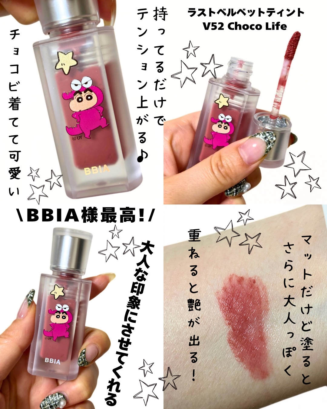 オリヤンで見かけたBBIAのチョコビエディションが可愛すぎて購入🥹 完全にパケ買い😂 テクスチャーはなめらかでしっとりしていて乾燥が全然気になりません! V52 チョコライフは少しブラウン味を感じるローズブラウン 暗すぎないので使いやすい!