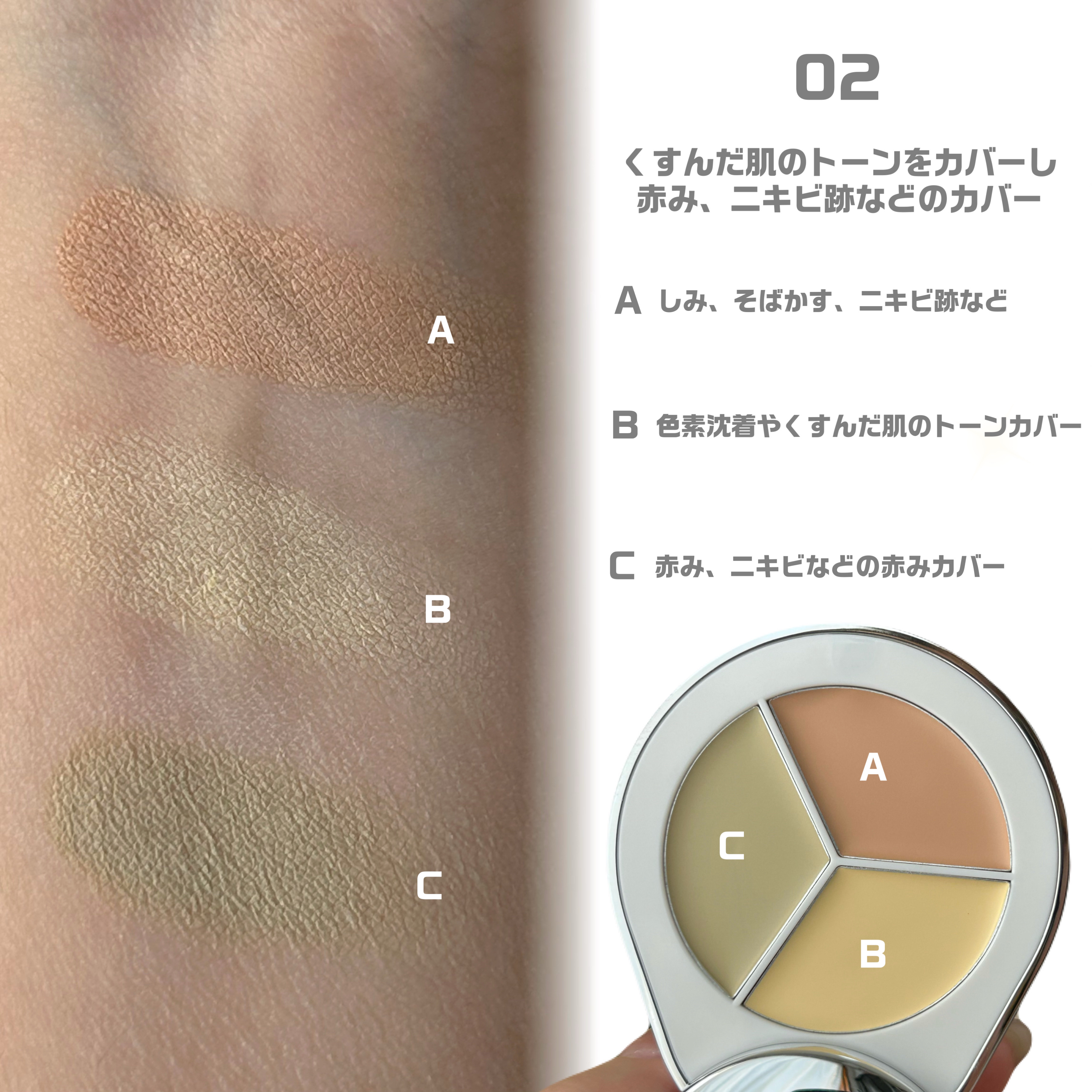 - 肌悩みに合わせた3つのタイプのコンシーラパレットです。 シミやトラブル跡などをカバーしてくれます。