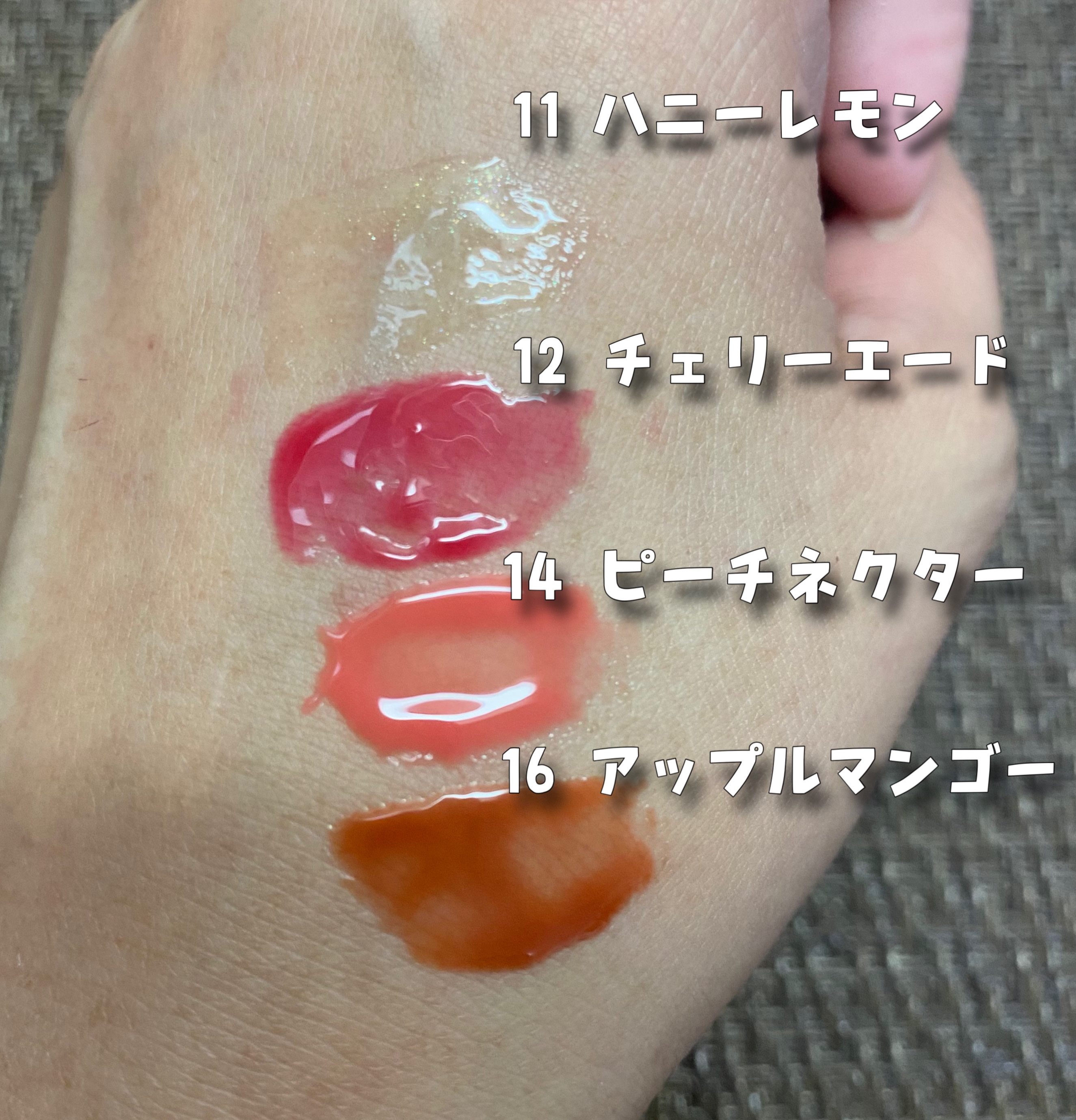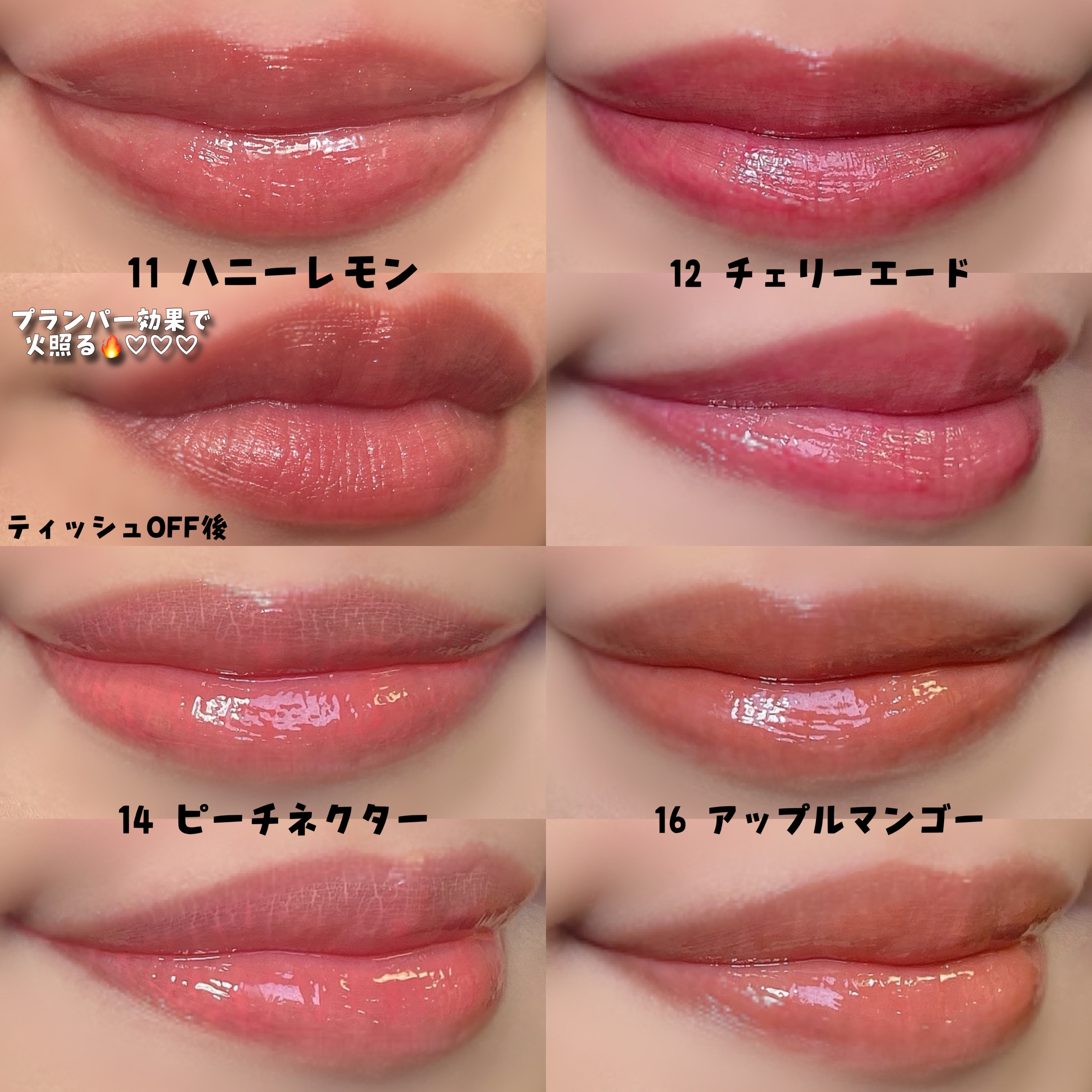 新色が4つもあるんだって🥹💖 11 ハニーレモン 12 チェリーエード 14 ピッチネクタ(3月発売予定の日本限定カラー) 16 アップルマンゴー(3月発売予定の日本限定カラー) コロンとしたパッケージが可愛くて 色もかわいい〜♡ ハニーレモンはキラキラしてて、あとの3色はガラス玉みたいなツヤツヤ感✨✨ プランパーの感じもしっかりあって ぷっくりとした仕上がり💕💕
