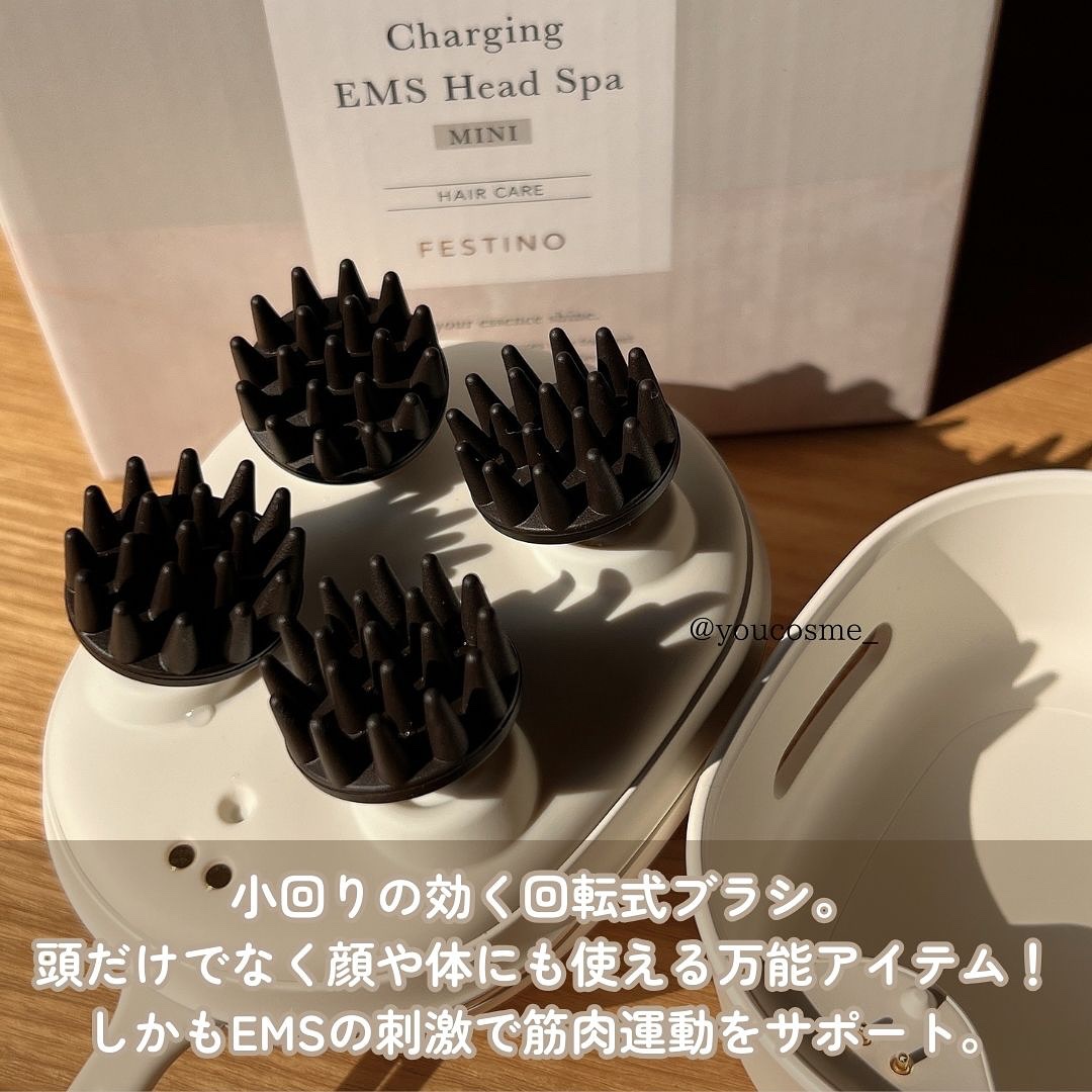 - 小回りのきく機敏派、全身を細やかに押し流すヘッドスパ。頭皮がベタつく、肌のハリ不足、髪にハリコシがない等のケアに◎ 回転ブラシが頭や顔・首周りなど ねらった部分にしっかりフィット。心地いい「快転もみ洗い」で、細やかに押し流し全身リフレッシュ。 アタッチメントブラシはシリコン製で着脱もカンタン。頭皮・ボディに使えるスパブラシが付属。(表情筋を引き上げる*1ようにハリケア/柔軟にする/肩・デコルテまわりに/頭皮をリフレッシュ/毛穴爽快クレンジング/シャンプーと一緒に) フェスティノのEMSは3段階の刺激レベルを調節可能です。 <EMS 使用の際のご注意>EMS は水分を通して電流を流します。使用したい部分を濡らしてご使用ください。 *1:機器を上に持ち上げながら使用すること