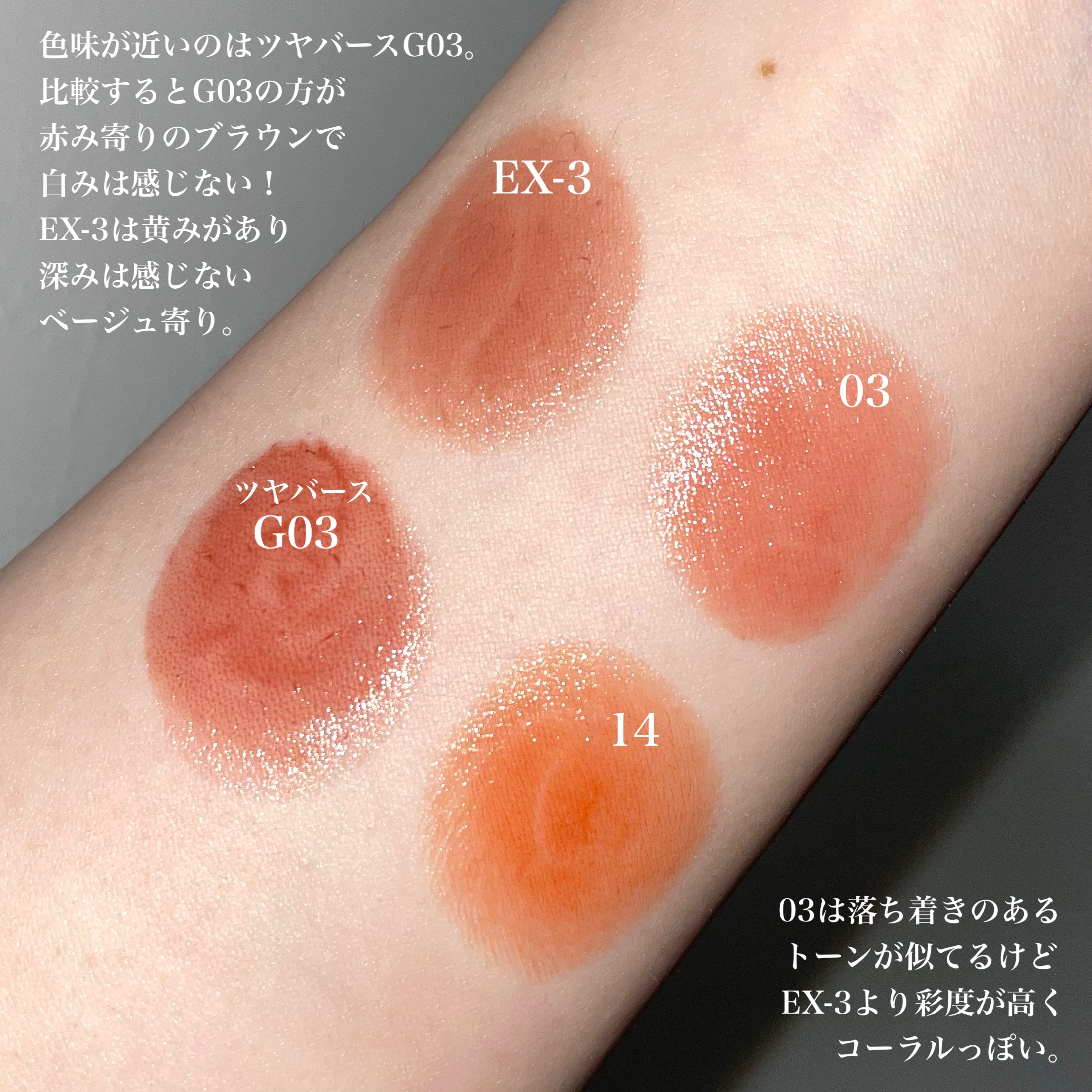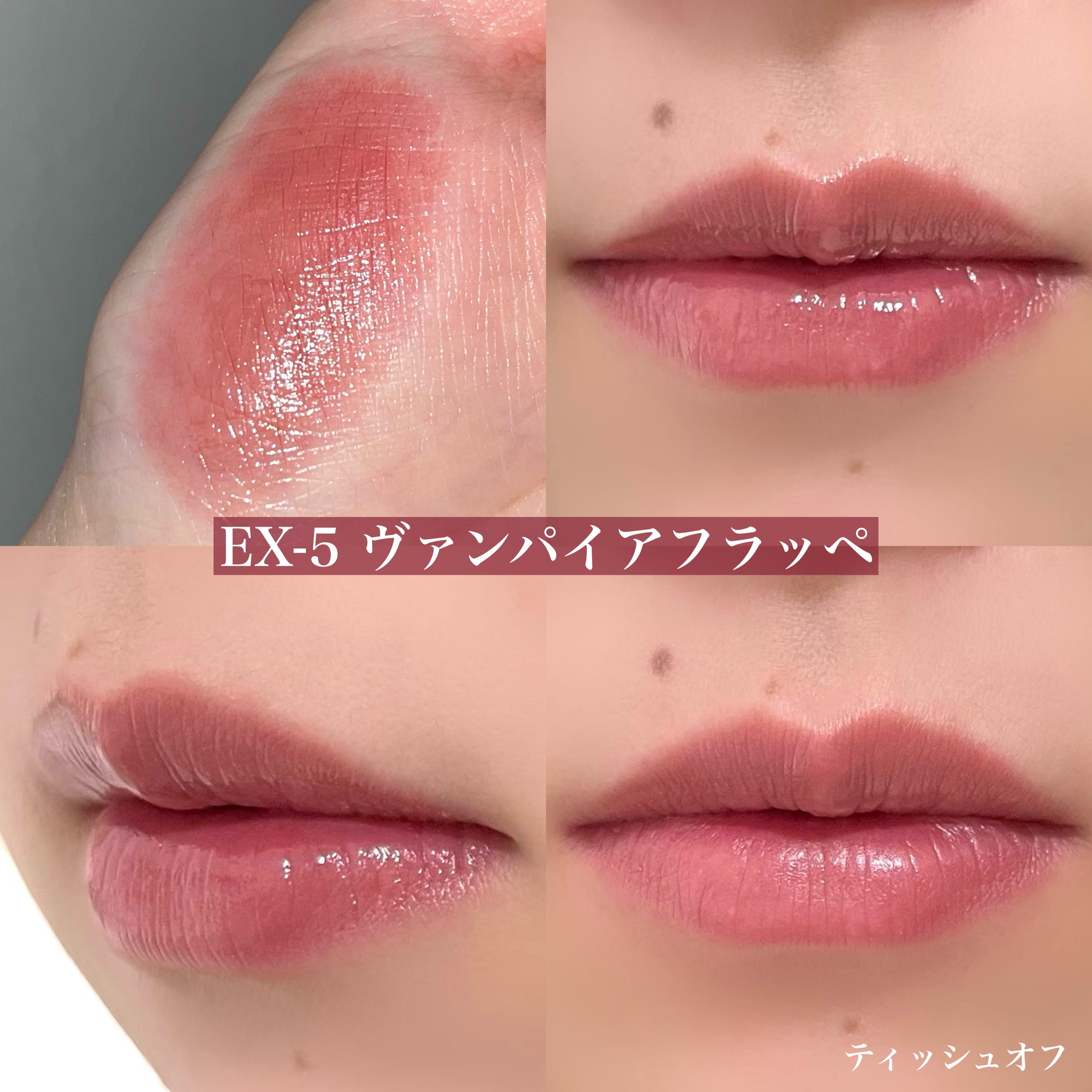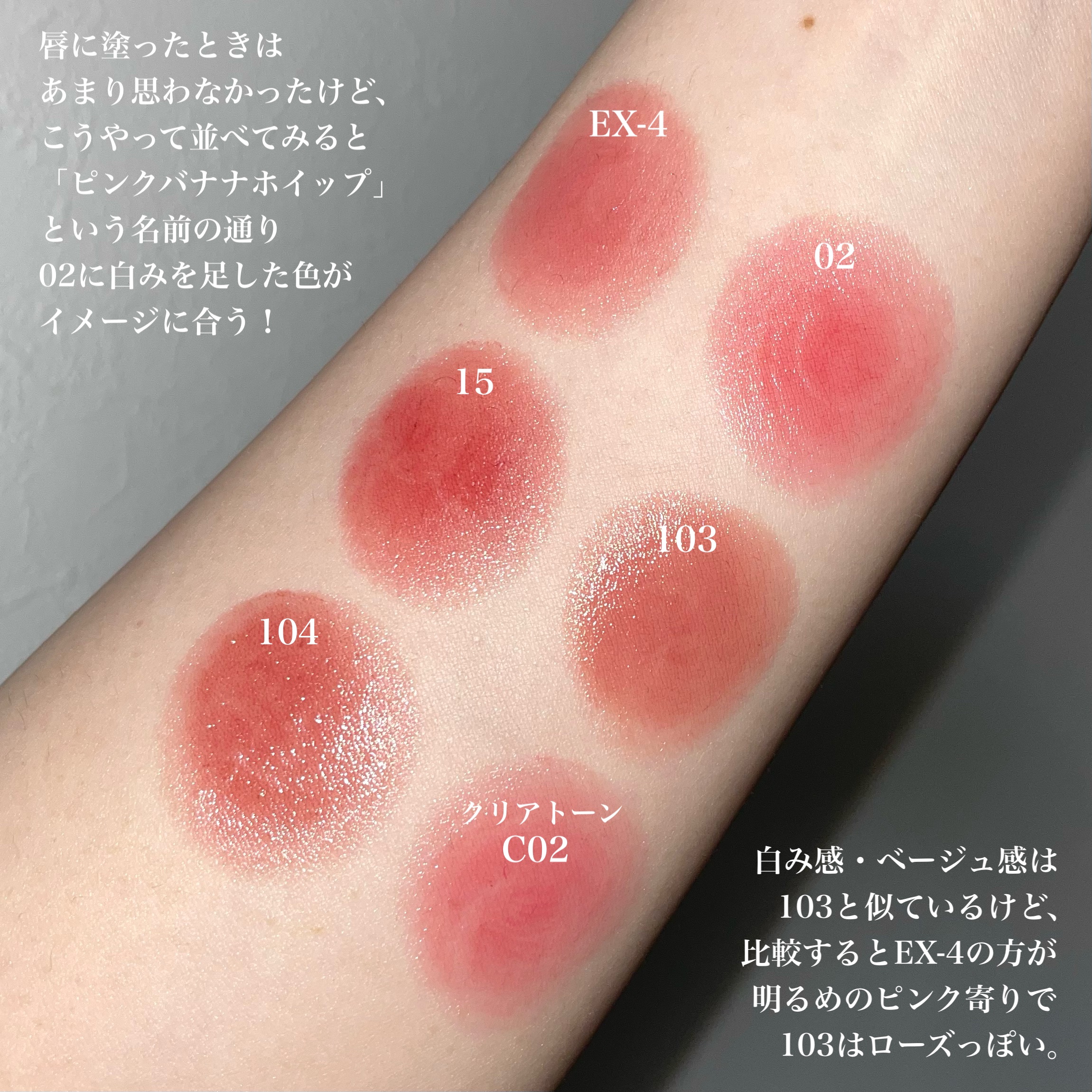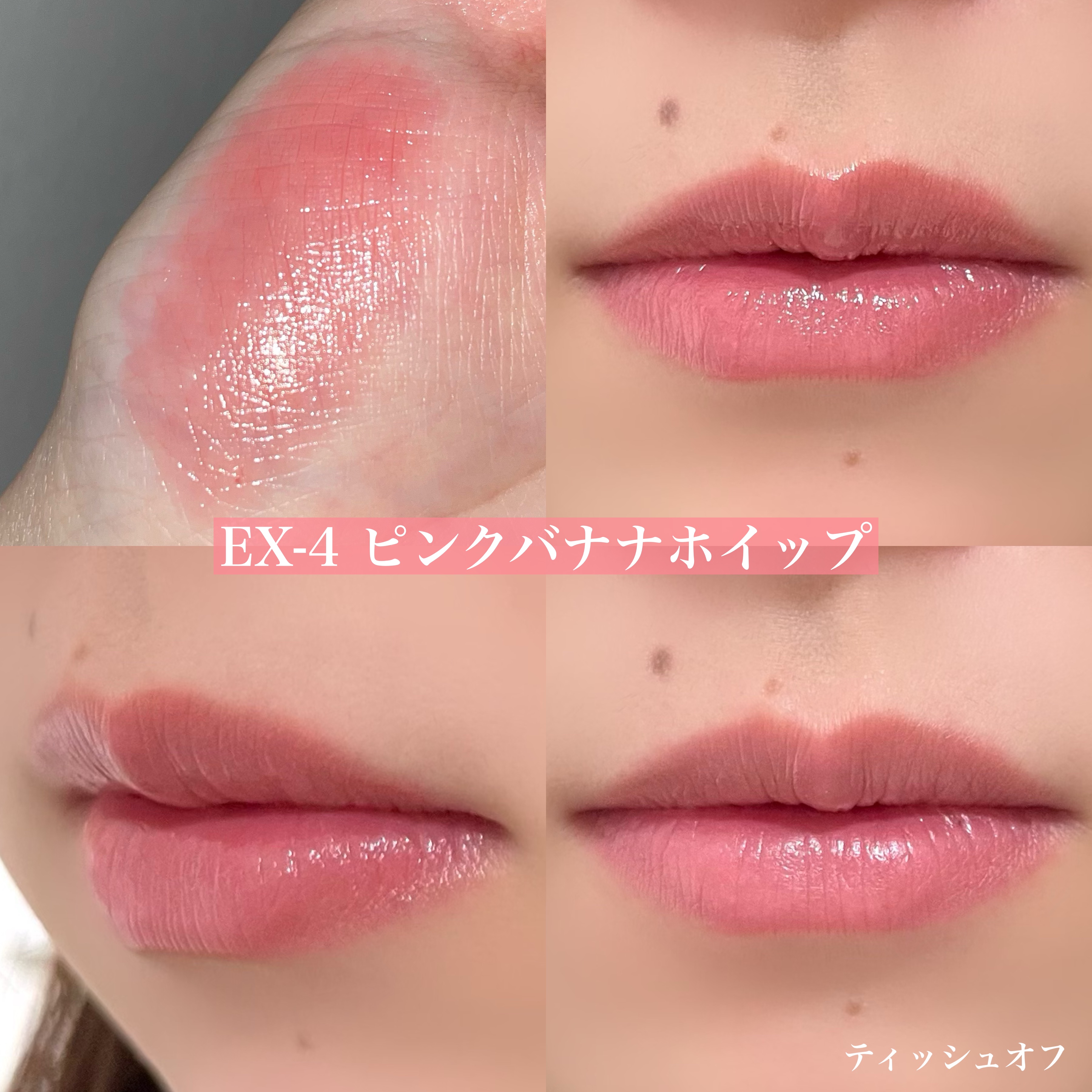 生焼けパンケーキは、むちっとした白みベージュでヌーディな唇に🤤 ピンクバナナホイップは、優しい白みピンクがPC問わず使えるカラー!これが1番好き🥺💖 今回のカラーは、前回のEX-1、2に比べると優しいヌーディなカラーでめちゃくちゃ使いやすい!!