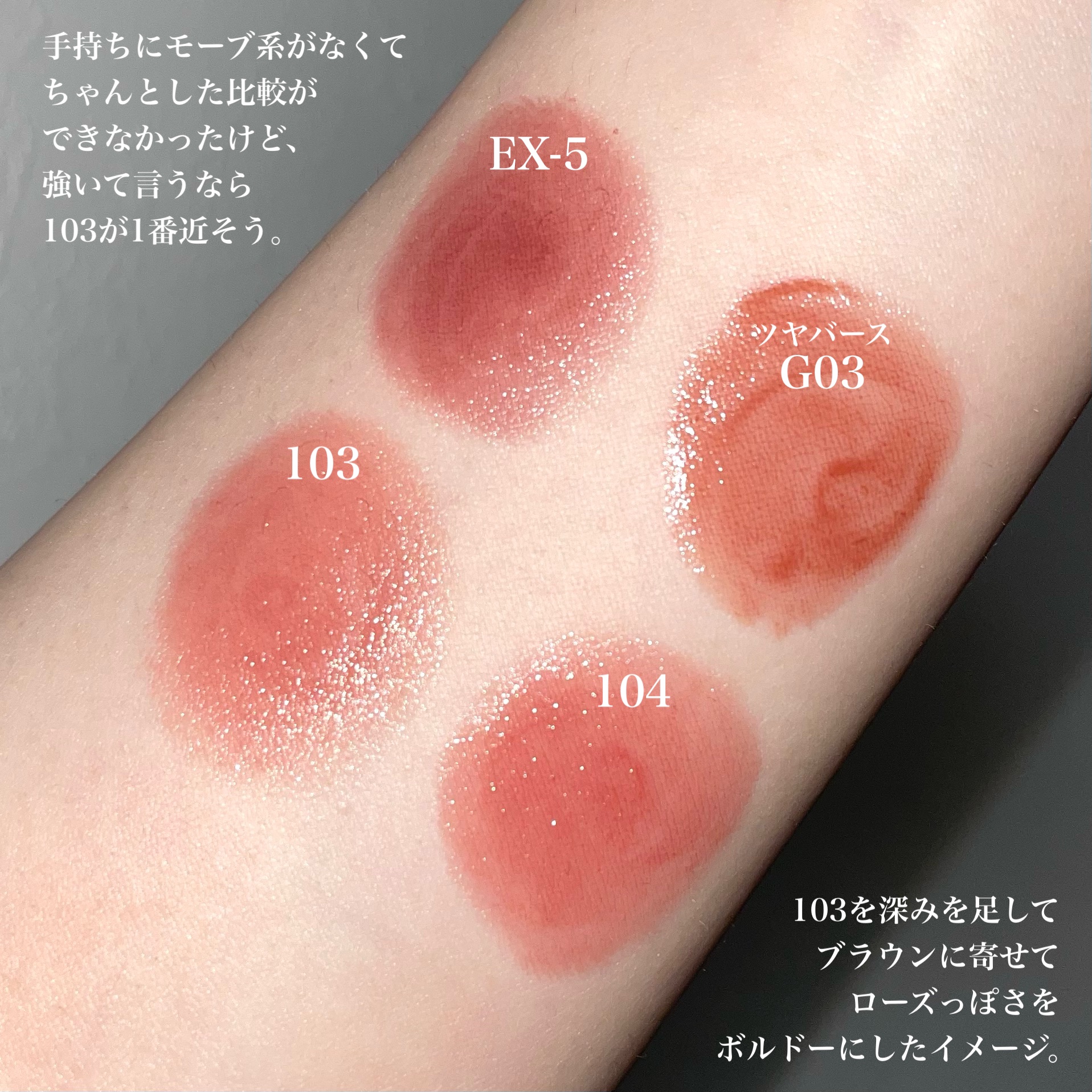 09 ダージリンピンク ピンクと名前が付いているけど スウォッチの印象は明るめオレンジブラウン。 11 クラウディーグレー 今回の5色の中だと1番濃いめのカラー。 12 イチゴストーム(限定) 他ではあまり見ない絶妙カラーで ラベンダーベージュといったイメージ。 14 イチゴキューピッド(限定) これぞ粘膜色!というような ピンクベージュ。 15 カプチーノピンク 期待を裏切らなかった可愛すぎる新色… 一言で言うなら白みピンクブラウン。
