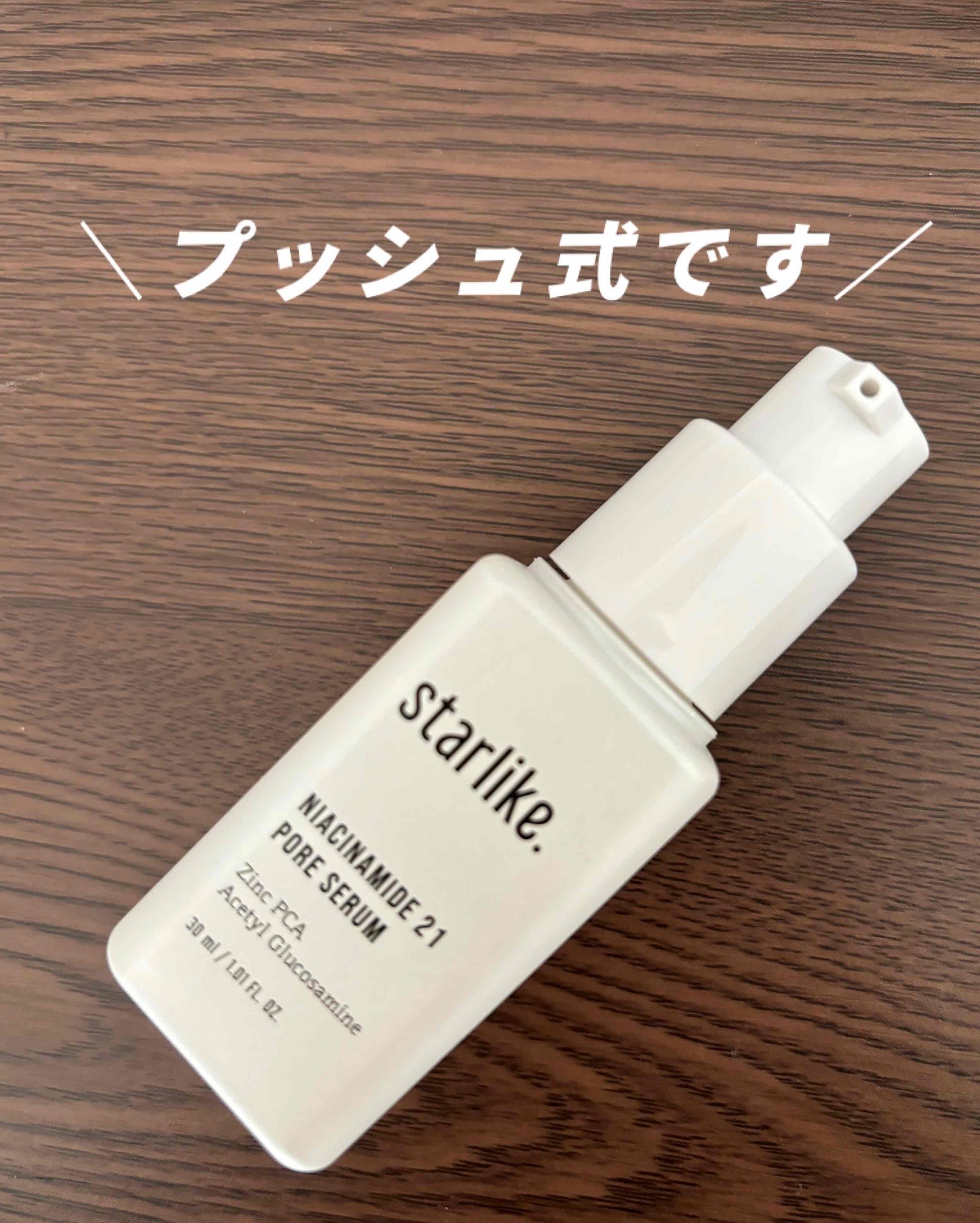最近人気急上昇中のstarlikeのナイアシンアミドセラム✨ 何種類かある中の、白いボトルのものです! ナイアシンアミド21%配合しているこちら💁♀️ 透明でとろみのあるテクスチャー。 臨床立証された毛穴改良、皮脂減少の効果があります。