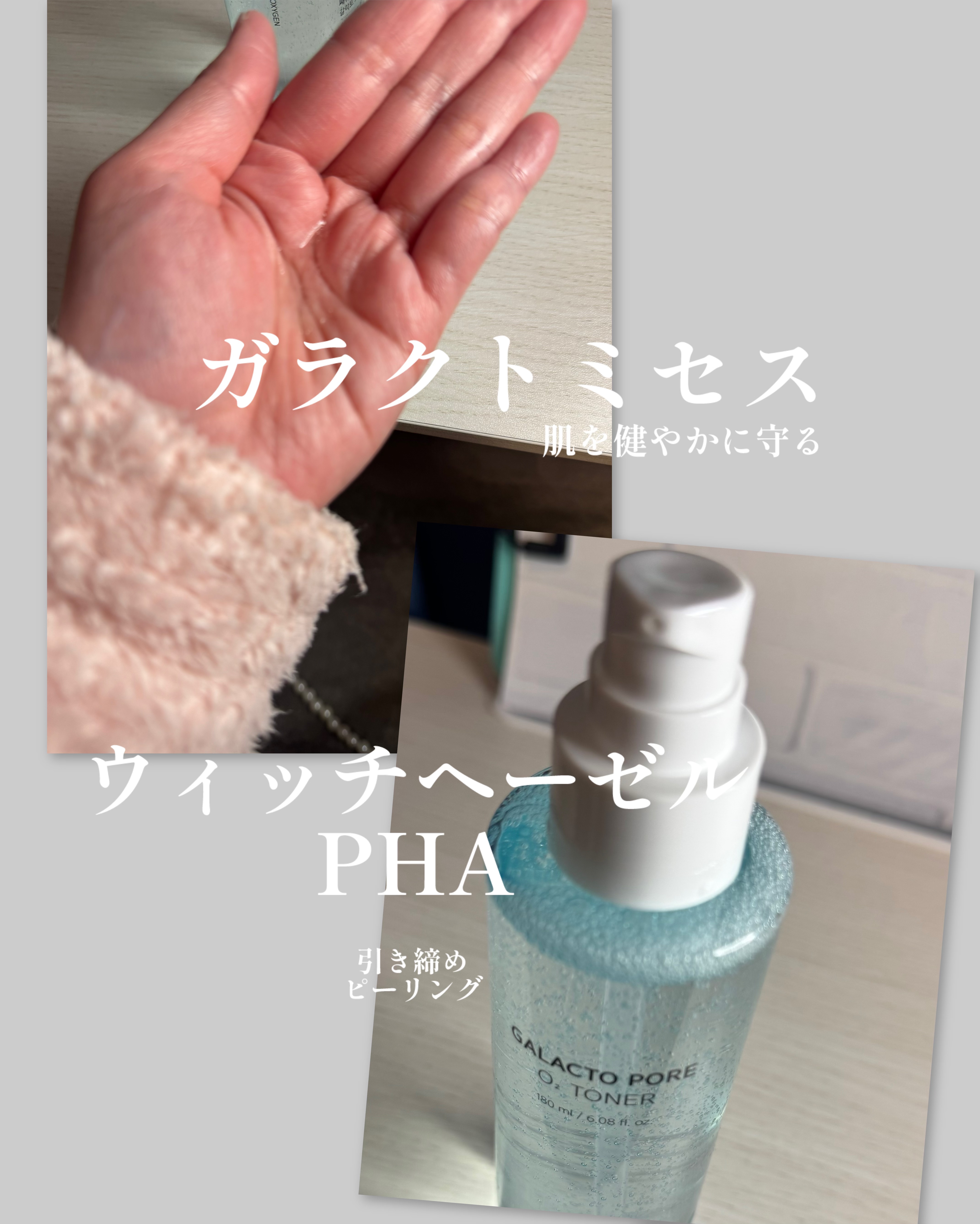 - ガラクトシリーズより新しく登場したガラクトポアオーツー(O2)トナー。 新感覚の酸素を含んだバブルエッセンスが毛穴に詰まった古い角質や過剰な皮脂をケアして肌のキメを整え、イキイキとした肌印象に導きます。 敏感なお肌にもやさしい使い心地で毛穴ケアが可能です。 しっとりべたつきのないテクスチャーで朝晩使用でき、さらに乾燥による毛穴目立ちを防ぐため肌表面に潤いを与えます。 皮膚低刺激テスト完了済*。敏感肌の方もご使用いただけます。 <特長成分> ガラクトミセス発酵ろ過物 : 肌にやさしい使い心地でうるおいを与える。(保湿成分) ウィッチヘーゼル : 肌を引き締めなめらかな印象をサポート。(整肌成分) PHA : 角質ケア成分配合。(角質柔軟成分) <テクスチャー&香り> - テクスチャー しっとり伸びやすく肌になじみやすいテクスチャー - 香り シトラスハーブ系 *全ての方に皮膚刺激が発生しないということではありません