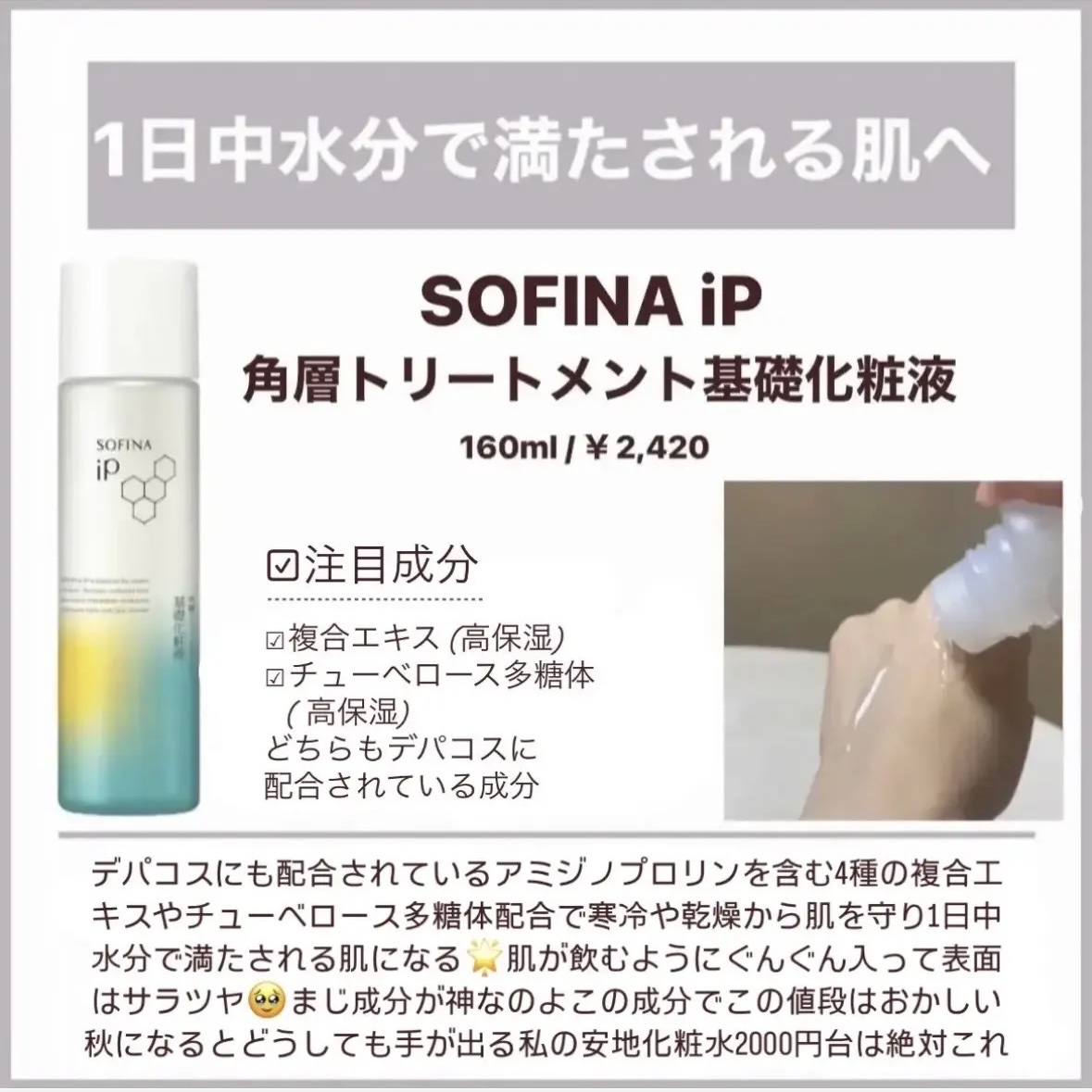 | 化粧水ランキング第165位 | テクスチャーはさっぱりめな感じですが、肌に広げると肌馴染みが良く、使い心地最高です! | 詳細を見る |